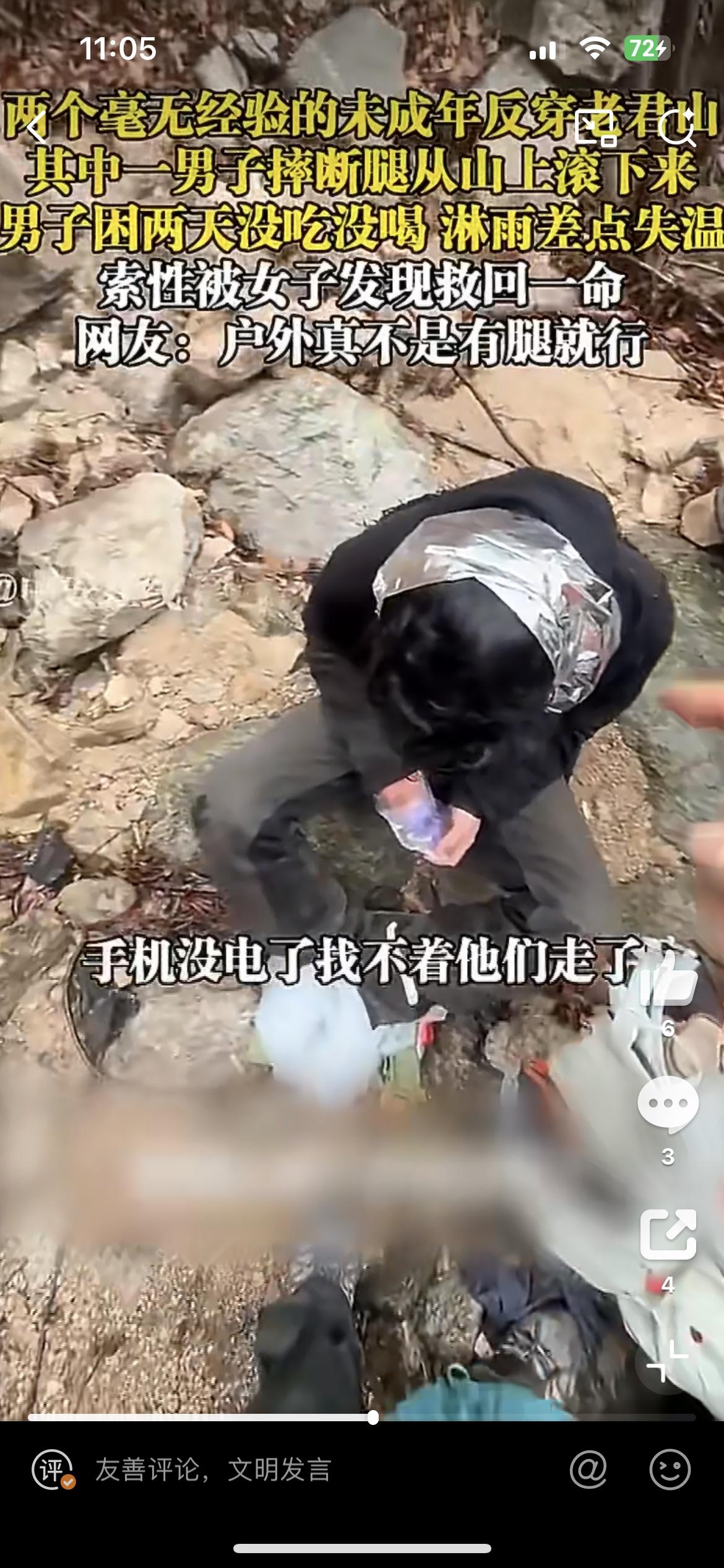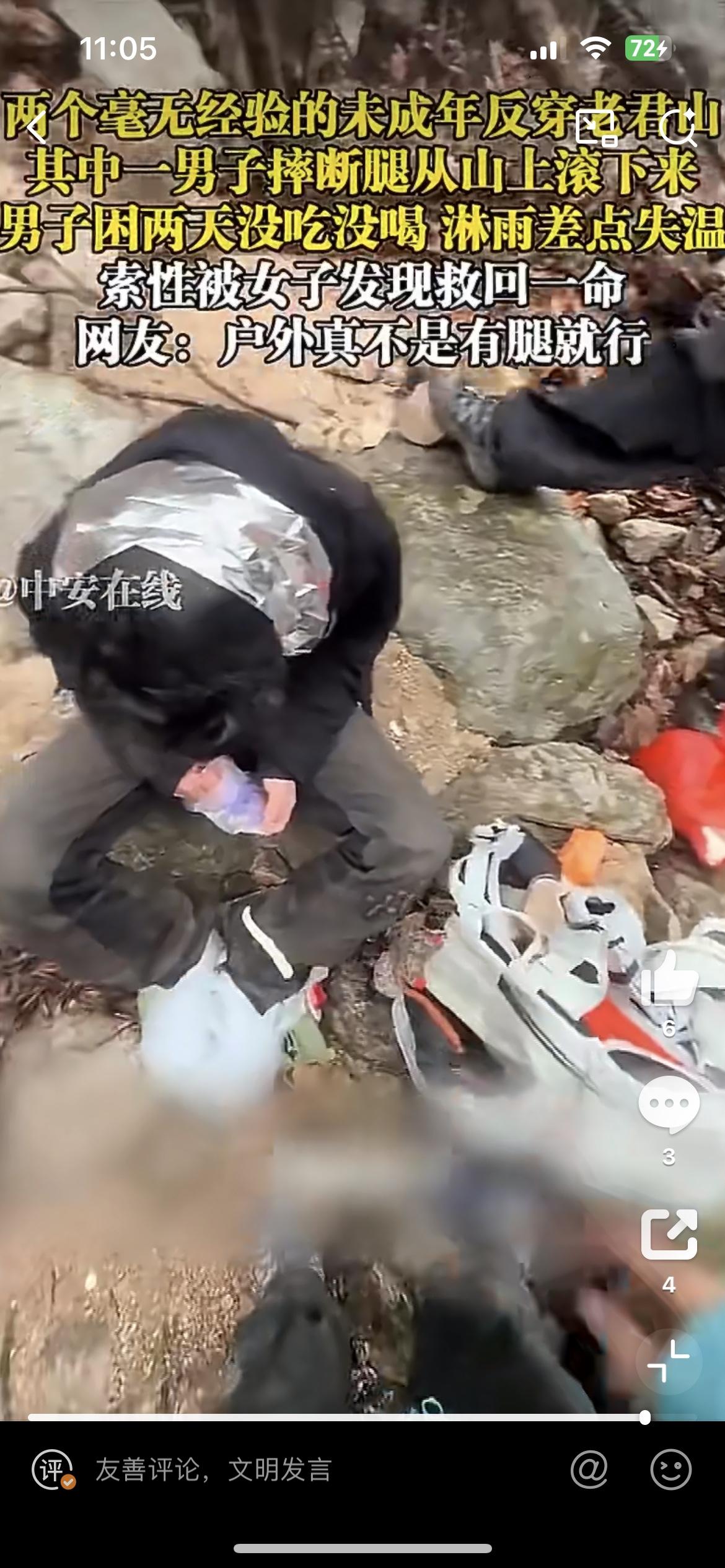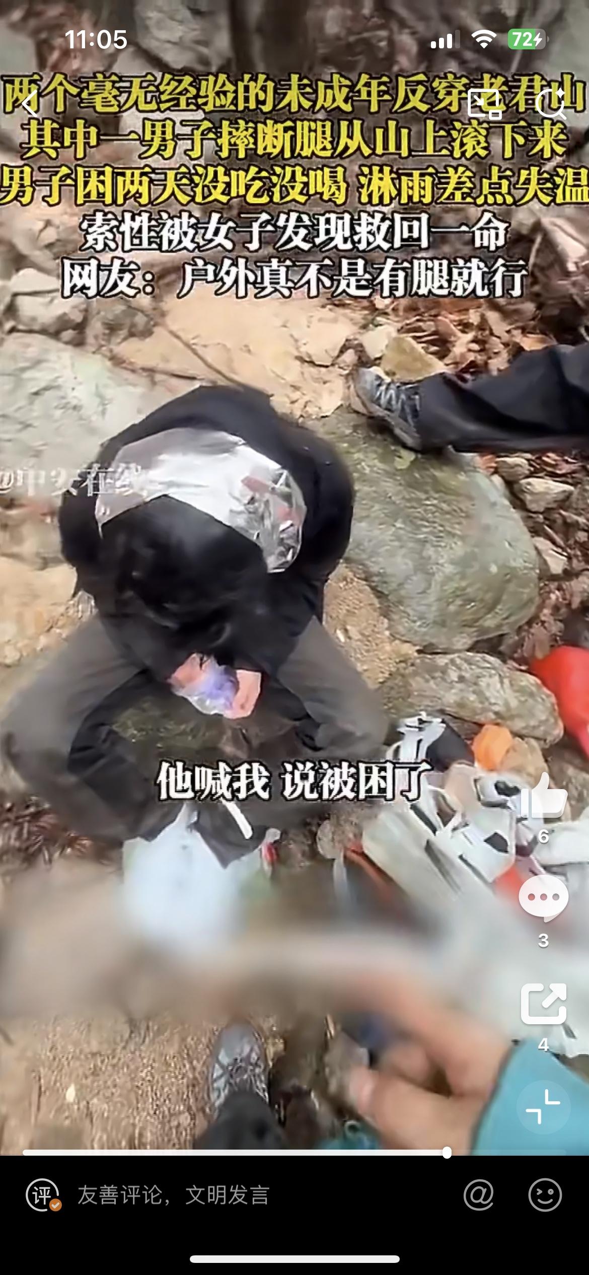 2小伙徒步河南老君山,其中一人摔断腿受困2天2夜,失温淋雨差点没命,幸得路过女子救助。3月1日,2小伙不做攻略,不准备充足的物质,盲目穿越老君山,行到半路,摔下山坡导致腿折。没吃没喝,手机还没电了,叫天天不应,天上还下雨,女子见到他们时冻得瑟瑟发抖。搞户外,不是凭一腔热情的。陕西老君山