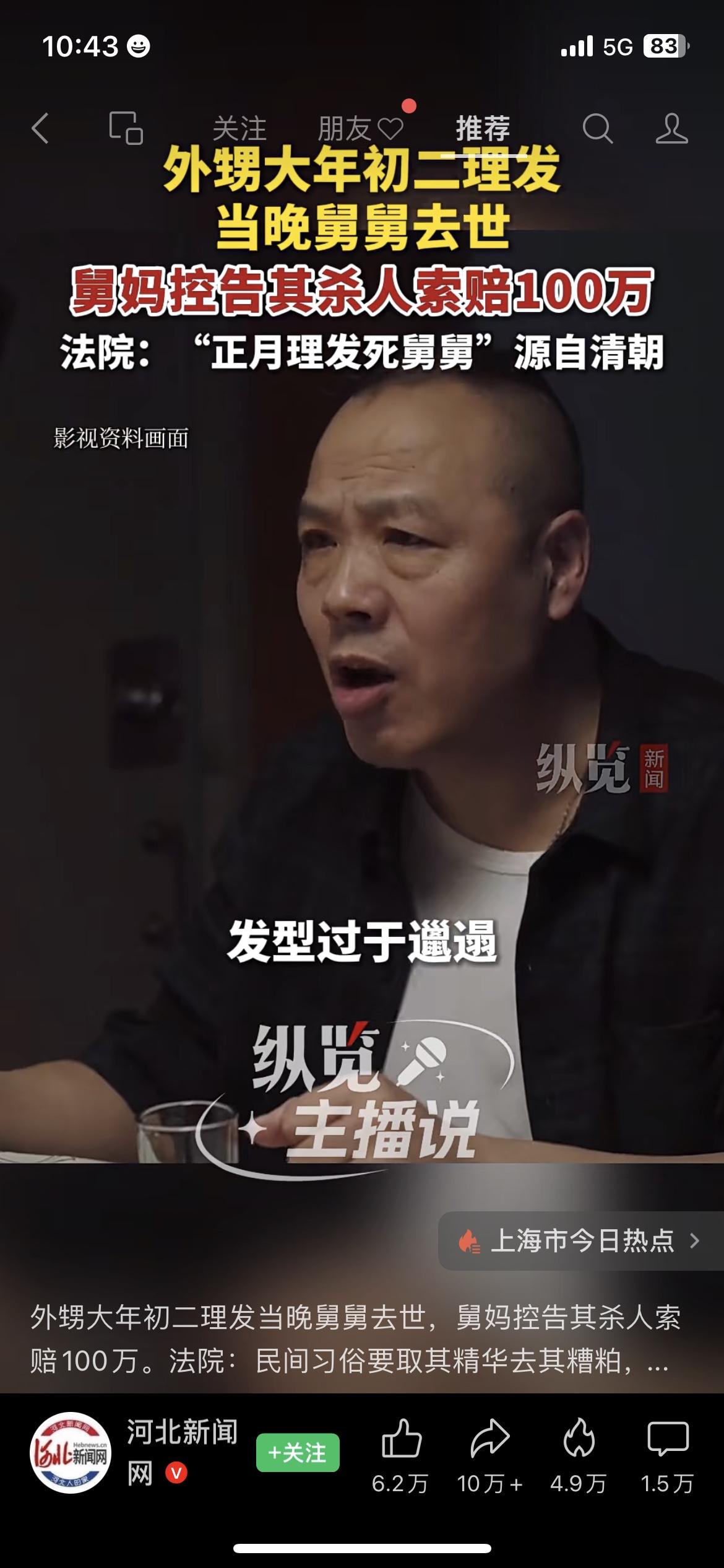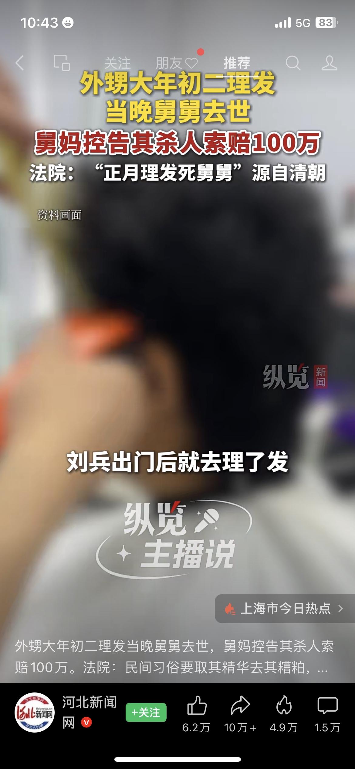 正月理发死舅舅”?舅妈索赔100万,法院一句话点醒所有人 昨天看到这个新闻,我真的又好气又好笑。 河北一个外甥,大年初二去理了个发,结果当天晚上舅舅就去世了。舅妈一口咬定是外甥理发“克死”了舅舅,把他告上法庭,索赔100万。 法院审理后认为,“正月理发死舅舅”的说法源自清朝,是一种民间习俗,没有任何科学依据。舅舅的去世与外甥理发没有任何因果关系,最终驳回了舅妈的诉讼请求。 说白了,这就是封建迷信在作祟。我老家那边也有类似的说法,很多人宁可信其有,不可信其无。 但法律是讲证据的,不是讲迷信的。 你们那边还有这种奇怪的习俗吗?评论区跟我聊聊。 民间习俗 法律常识 正月理发
