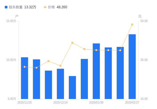 日期A股户数(户)流通A股户均持股数(股)户均持股市值(万元)2026-02-271331534904.4023.672026-02-131168695587.7619.572026-02-101162665616.7419.722026-01-301213945379.4718.902026-01-201014416437.5922.972026-01-09795458209.6431.952025-12-19888607349.0419.922025-12-10865057549.1122.252025-11-281009406469.5416.872025-11-201035726305.1416.72