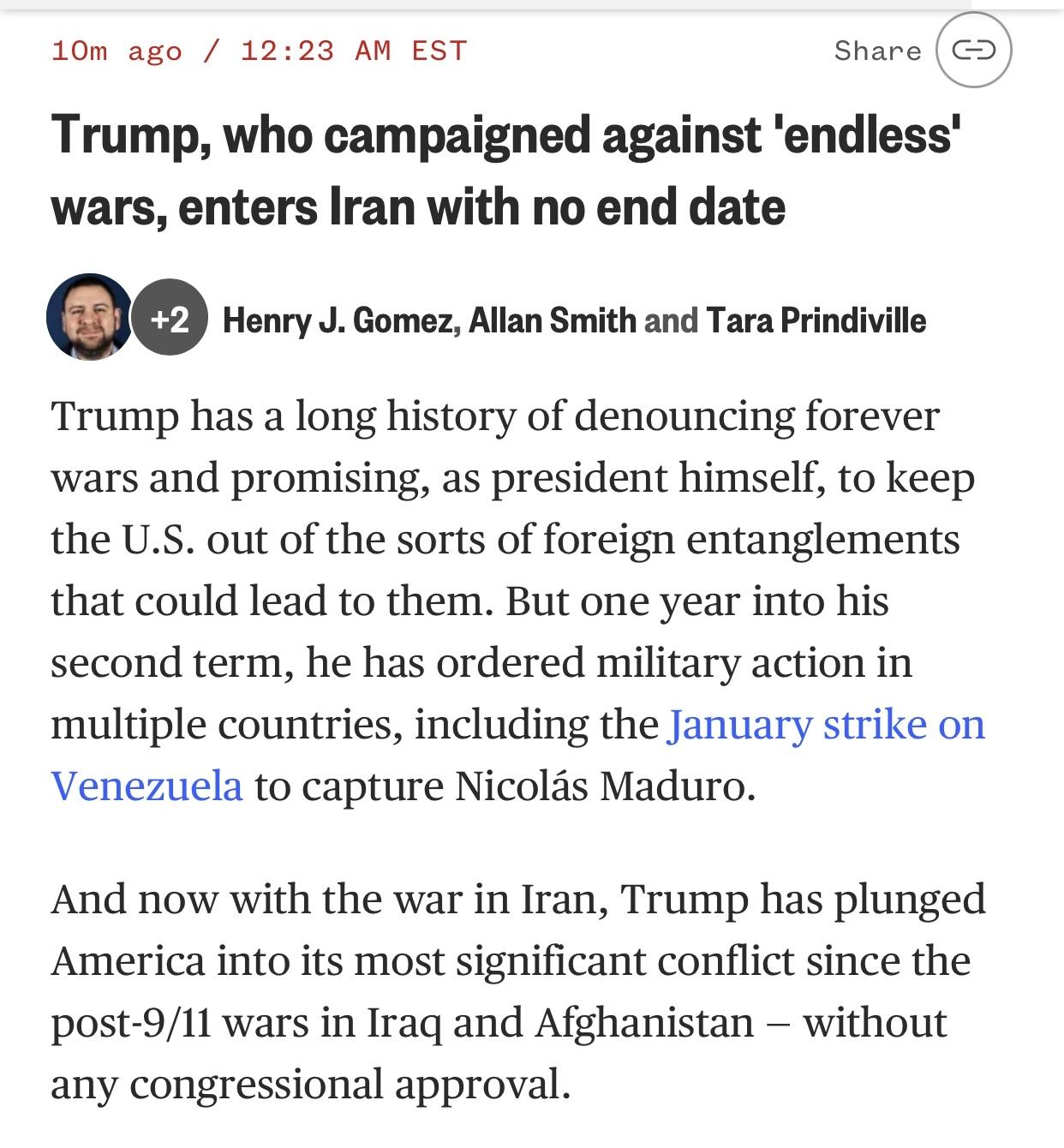 美媒:特朗普对战争持续多久举棋不定 美国全国广播公司新闻(NBC News)官网3月3日报道:特朗普长期以来一直谴责无休止的战争,并承诺自己作为总统,将使美国摆脱可能导致这些战争的外国纠葛。但在其第二任期的一年里,他已下令在多个国家采取军事行动,包括今年1月对委内瑞拉发动袭击以抓捕尼古拉斯·马杜罗。 报道说,现如今,伊朗战争爆发,且特朗普未经国会批准,便将美国推入了自9/11后的伊拉克和阿富汗战争以来最重大的冲突之中。在今天的新闻发布会上,国防部长皮特·赫格塞斯(Pete Hegseth)反驳了伊朗可能成为特朗普的伊拉克的说法,并承诺不会让战争陷入“无休止”的境地。但特朗普本人表示,美国的参与时间可能比他预想的要长。 特朗普在白宫的荣誉勋章颁奖典礼上说:“从一开始,我们就预计四到五周”,”但我们有能力进行的更久”(“Right from the beginning, we projected four to five weeks,” Trump said at a Medal of Honor ceremony at the White House. “But we have capability to go far longer than that.”)。 报道的原标题是《Trump, who campaigned against 'endless' wars, enters Iran with no end date》(反对“无休止”战争的特朗普,又称没有结束日期)。