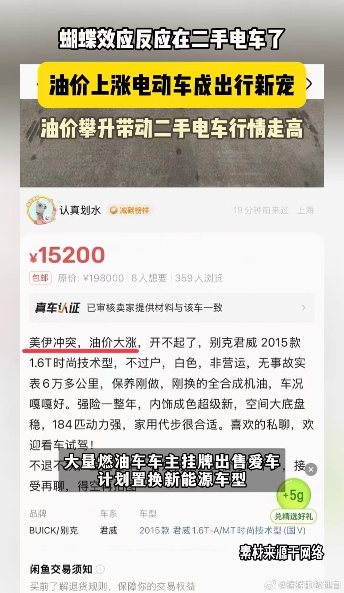 油价上涨电动车成出行新宠油价上涨电动车转卖价升高 地缘冲突推高油价,燃油车出行成本失控,电动车成“避险项”。海鲜平台热度升,转卖价涨,换车潮渐显。