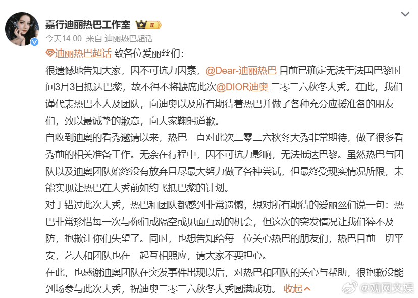 工作室称迪丽热巴目前一切平安3月3日,发文,称因不可抗力因素,迪丽热巴将缺席在巴黎举办的迪奥2026秋冬大秀。并表示热巴目前一切平安,艺人和团队也在一起互相照应,请大家不要担心。迪丽热巴 滞留迪拜
