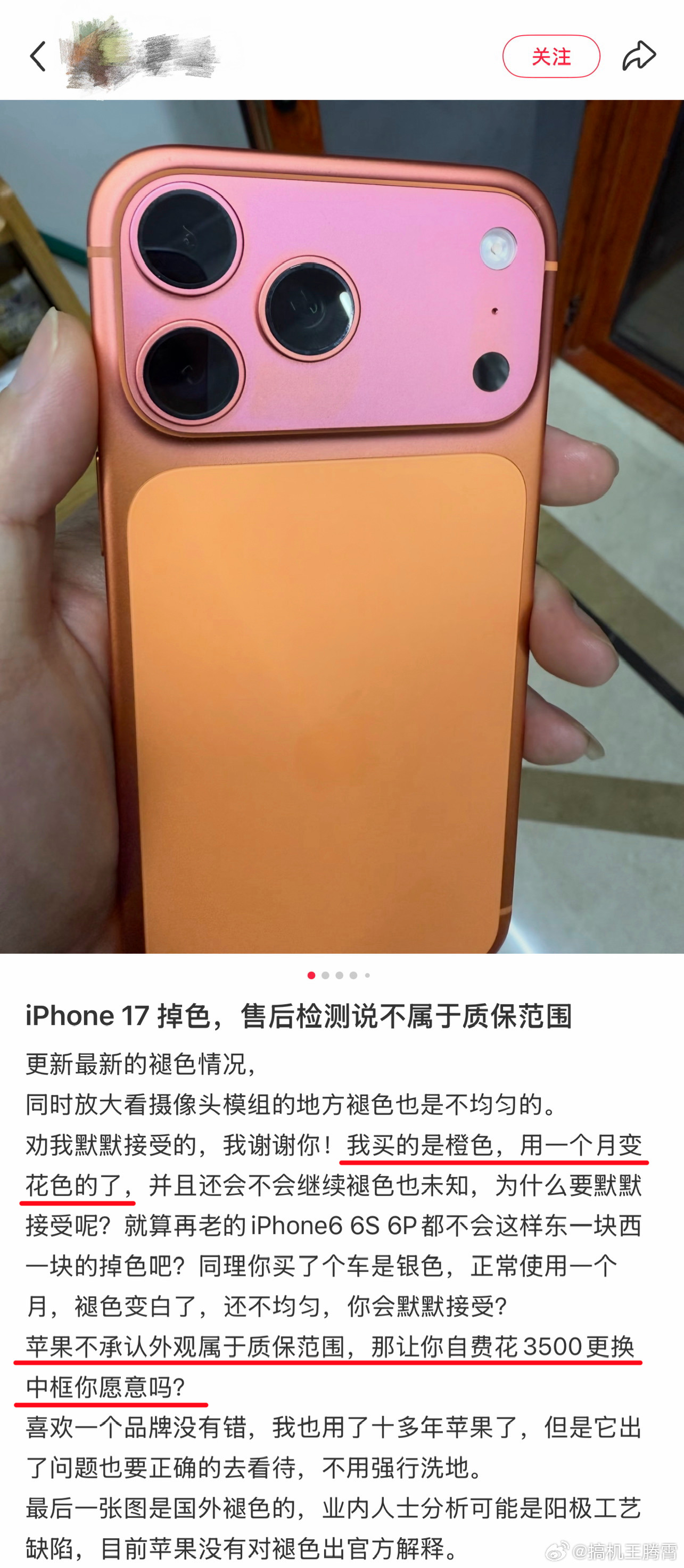 iPhone17只用一个月橙色变粉色这问题之前已经出现过很多例,主要区别在于碰上这问题的这个消费者才刚买一个月,星宇橙配色的iPhone17 Pro Max就开始掉色变粉,售后说不属于质保范围,让她花3500元重新换个中框,那我觉得就不是太合理了,毕竟不是个例,你们觉得这种情况果子应该售后吗?