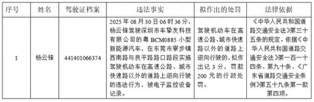机动车驾驶人杨云锋,驾驶深圳市车挚友科技有限公司的粤BCM08**小型新能源汽车,因道路交通违法行为被电子监控设备记录,当事人未在限定期限内接受处理。根据《中华人民共和国行政处罚法》第四十四条、《公安机关办理行政案件程序规定》第一百六十八条的规定,现将其对应违法事实、理由和处罚依据公告告知如下,请自公告之日起七日内向东莞市公安局交通管理支队寮步大队(地址:东莞市寮步镇凫山银都工业区寮步交管大队,联系人:陈警官、李警官,联系电话:0769-83283972)提出,逾期不提出的视为放弃陈述和申辩、放弃听证。