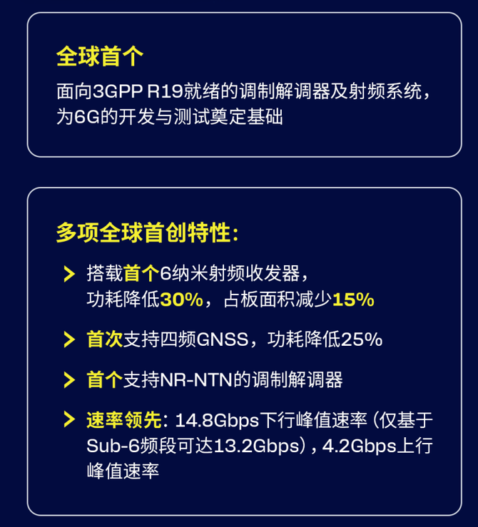 为了实现从5G到6G的平滑过渡,高通还推出了全球首款面向3GPPRelease19就绪的X1055G调制解调器及射频系统,成为5G-A领域的标杆产品。该产品实现了14.8Gbps下行峰值数据速率和4.2Gbps上行峰值数据速率,引入6纳米射频收发器、四频GNSS等全球首创特性,功耗较前代降低30%,占板面积减少15%。
