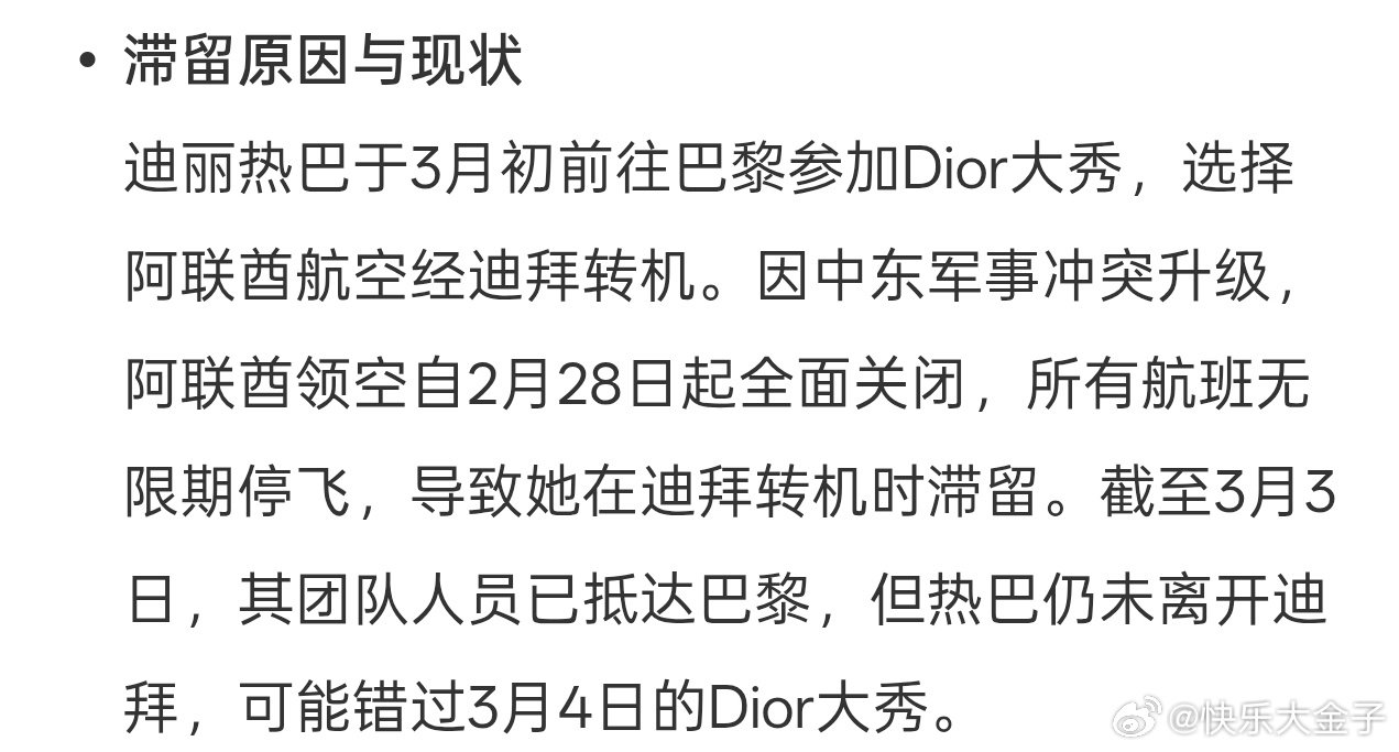 迪丽热巴工作室发公告,热巴将缺席迪奥秋冬大秀,并表示热巴一切平安。看智搜总结才知道,热巴和团队在迪拜转机时滞留了另外也有部分工作人员直接直飞到巴黎。哎,希望一切顺利迪丽热巴缺席迪奥2026秋冬大秀 迪丽热巴将缺席时装周