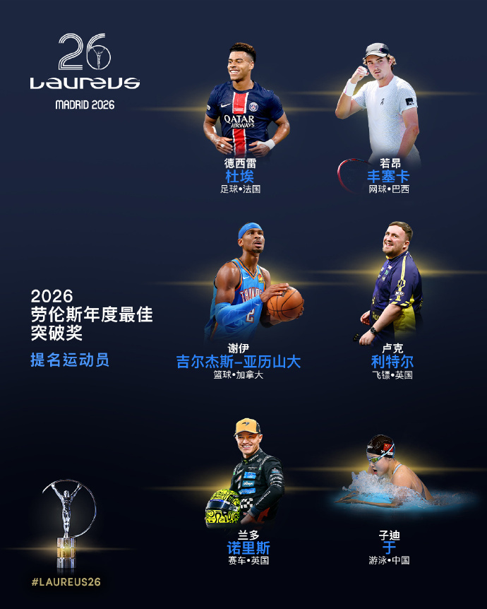 虎扑03月03日讯今日,劳伦斯世界体育奖公布2026年度最佳突破奖提名运动员名单,14岁中国游泳小将于子迪入选。