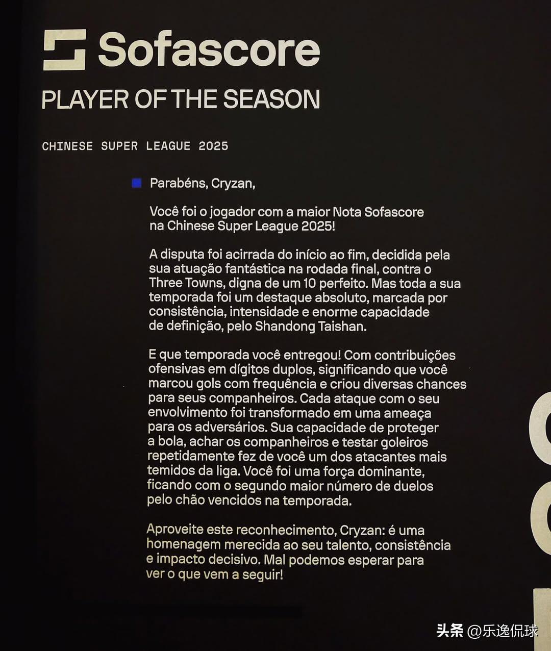 实至名归!泰山王牌克雷桑斩获2025中超赛季最佳,新赛季放话:还有更多! 今天,山东泰山外援克雷桑更新社媒,晒出了自己收到的重磅荣誉——Sofascore官方颁发的2025赛季中超联赛最佳球员奖杯,正式拿下这份纯靠赛场表现打出来的硬核大奖! 常看球的都懂,Sofascore的赛季最佳含金量有多足:完全以全赛季每一场的赛后评分为唯一标准,没有任何人情分,是对球员一整个赛季稳定表现的最高认可。克雷桑以场均7.88分的超高评分,登顶2025赛季全中超第一,拿下这个奖项当之无愧。 更让人叫绝的是,这份最佳的争夺全程胶着,正是克雷桑在联赛收官战对阵武汉三镇的比赛中,轰出了满分10分的封神级表现,用一场完美发挥直接锁定了赛季最佳的头衔,把“大心脏”属性拉到了极致。 整个2025赛季,克雷桑就是山东泰山前场最无解的存在: 进攻端交出进球+助攻双两双的顶级数据,既能自己当稳定终结点,又能持续给队友创造绝佳机会; 超强的护球能力、持球冲击力,让他每一次拿球都能成为对手防线的噩梦,更是整个中超地面对抗赢下次数第二多的球员,统治力肉眼可见。 拿到奖杯的克雷桑难掩喜悦,他坦言:“非常开心今天在家收到了Sofascore颁发的2025中超最佳球员奖项,很荣幸能得到这份认可!所有的荣耀永远归于上帝,而今年,还有更多的目标等着我们!” 从加盟泰山以来,克雷桑就一直用稳定的输出、敬业的态度,成为了中超外援的标杆,更是泰山球迷心中当之无愧的“桑神”。这份迟来的赛季最佳,是对他一整个赛季付出的最好回馈。 新赛季中超大幕即将拉开,已经放话“还有更多目标”的克雷桑,又会和山东泰山一起,给我们带来怎样的惊喜? 评论区聊聊,你觉得克雷桑上赛季的表现,配得上这个中超最佳吗?新赛季你对他有什么期待?