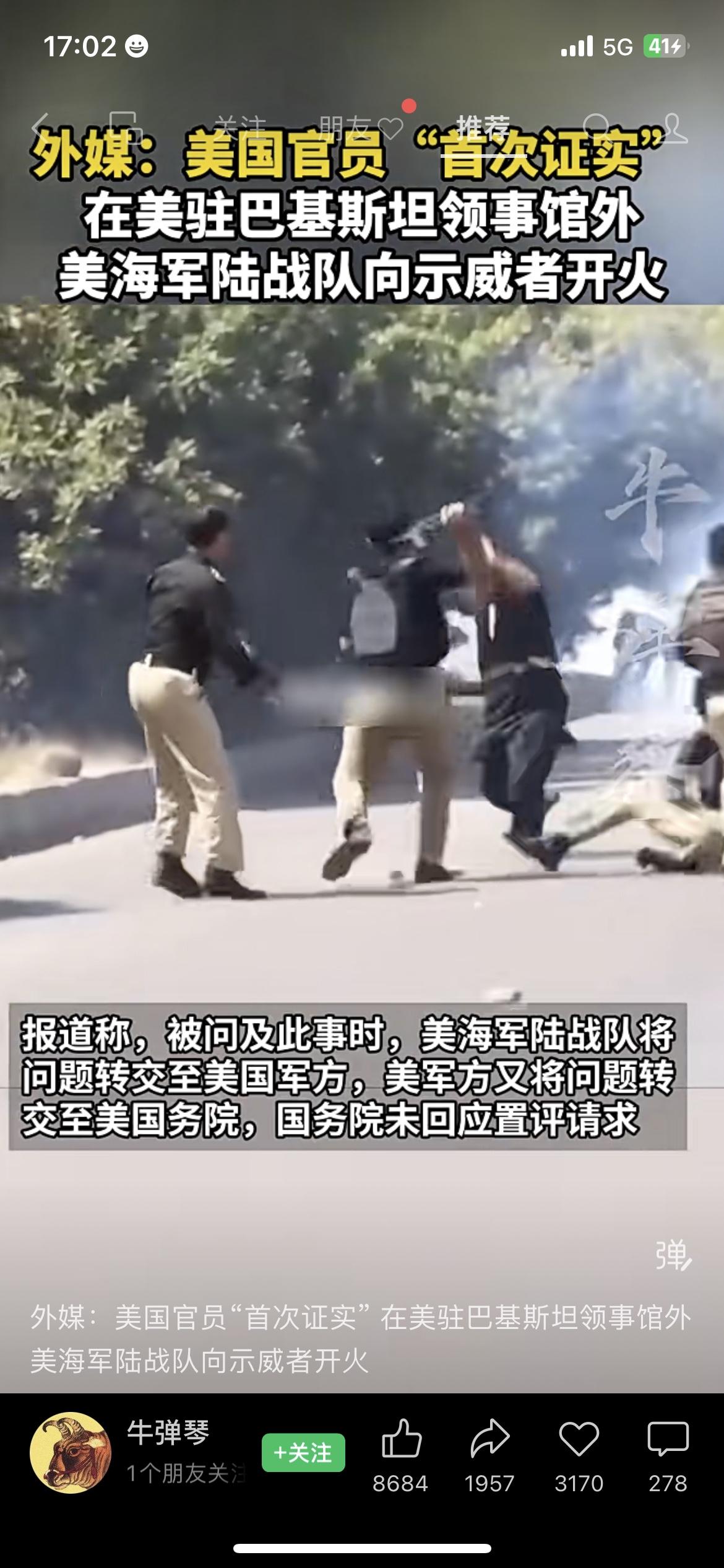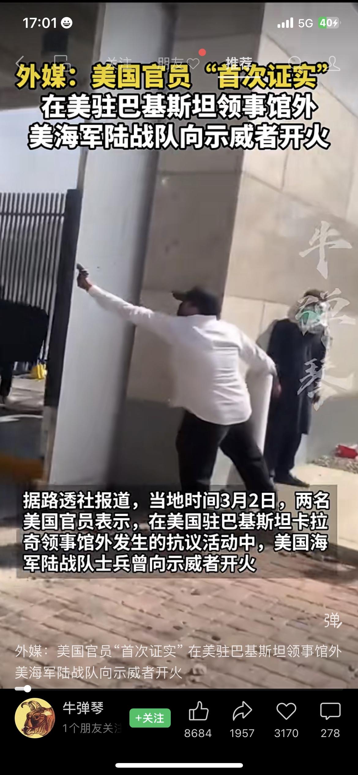 路透社刚爆的料:美国官员首次证实,美海军陆战队在驻巴基斯坦卡拉奇领事馆外向示威者开了火。 我刷到视频的时候,手都在抖。在外交机构门口直接动武,这哪是“维护秩序”,分明是把霸权写在了脸上。 更讽刺的是,被问到这事时,陆战队推给军方,军方推给国务院,最后国务院直接装死不回应。 说白了,这就是典型的美式双标:在别人的国家,用自己的规则,干着最野蛮的事。 这种事发生在2026年,真的让人脊背发凉。 你怎么看美国这种“外交暴力”?评论区聊聊。 美国 巴基斯坦 霸权主义 国际热点巴基斯坦交火