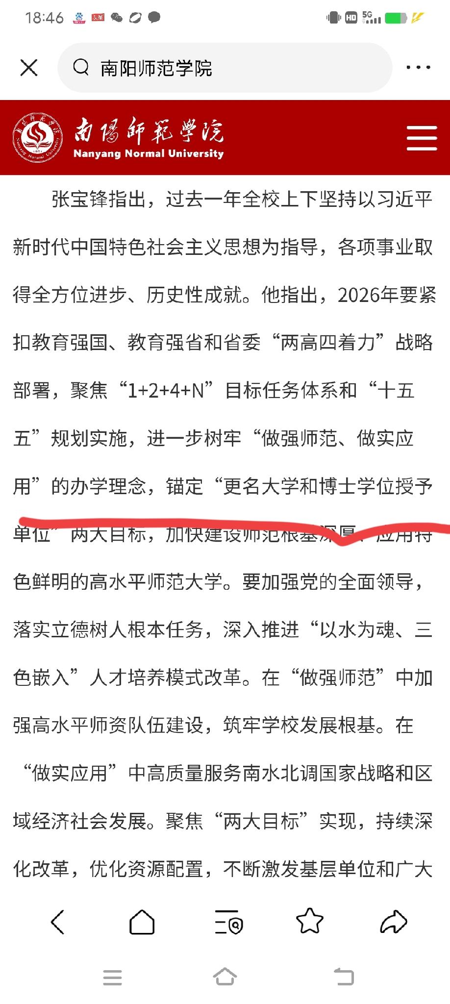 南阳师范学院2026年工作会议: 锚定“更名大学和博士学位授予单位”两大目标,加快建设师范根基深厚、应用特色鲜明的高水平师范大学。看来,南阳师范学院更名已经迫在眉睫了。欢迎大家留言文明交流!