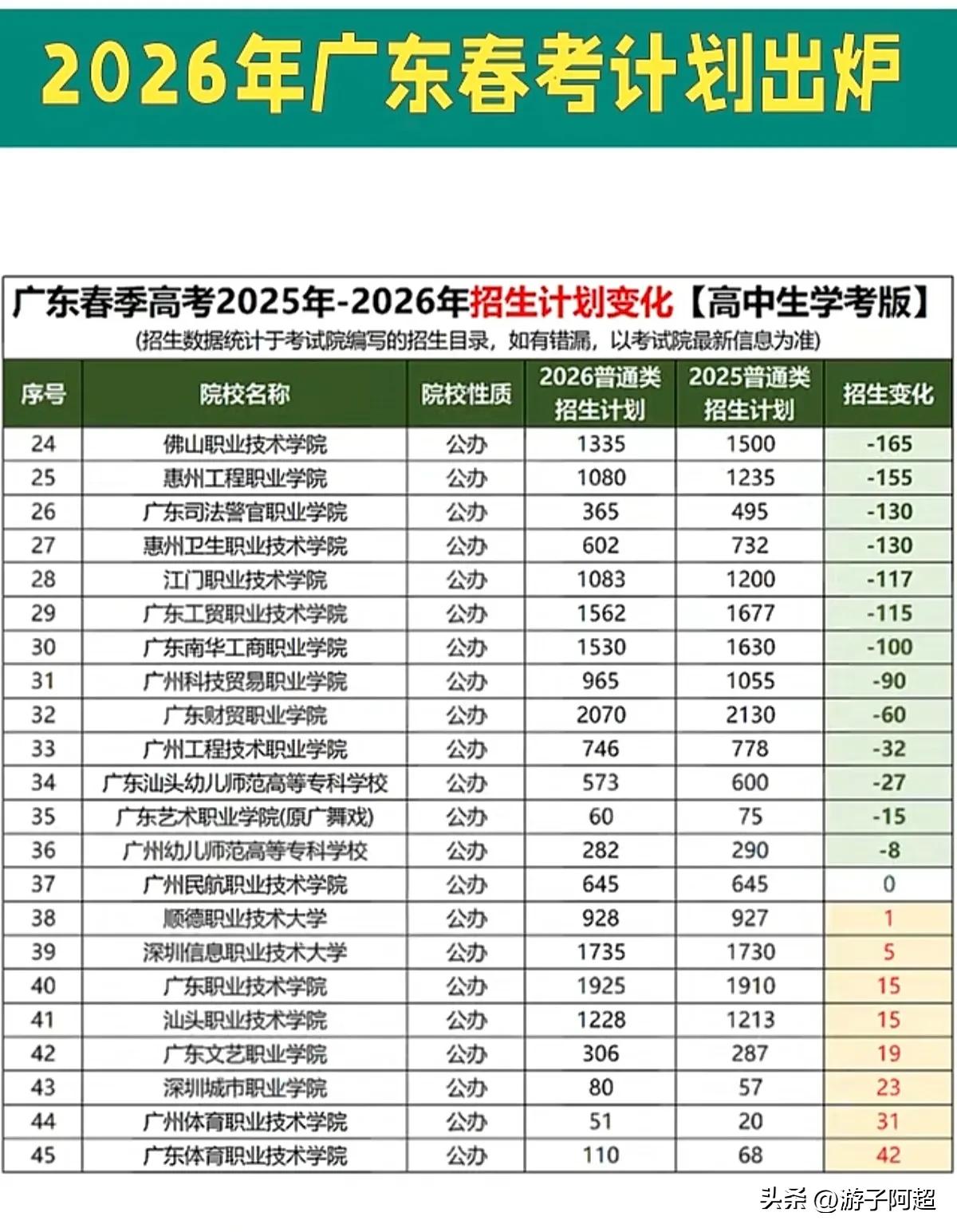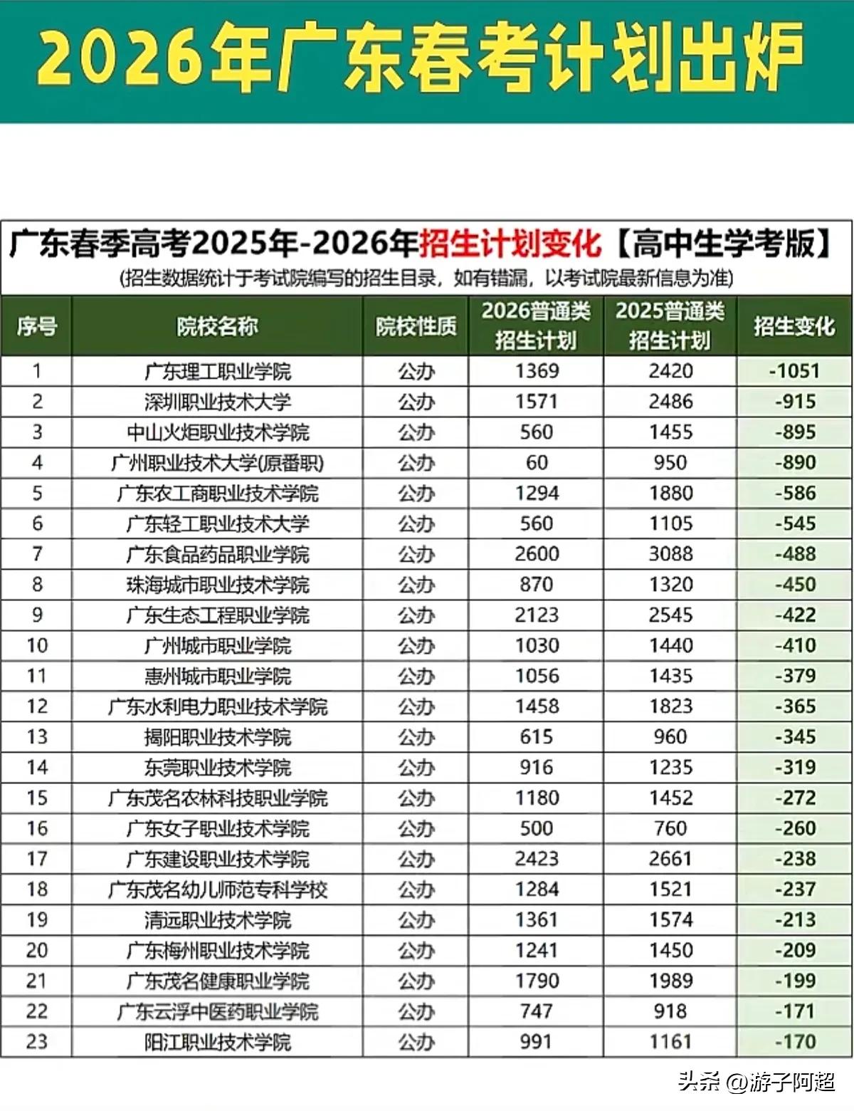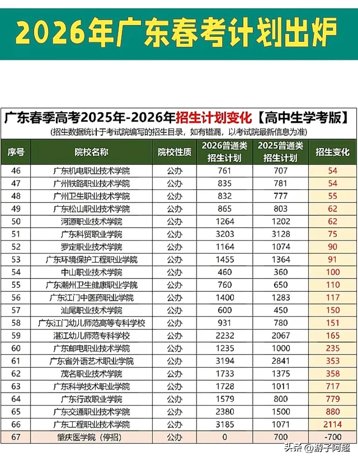 2026年广东省春季高考招生计划已全部公布。 与上一年度相比,今年广东省春季考试中公办及民办院校合计缩减招生规模超过1.1万名。 值得关注的是,肇庆医学院自2024年转型为公办全日制本科普通高校后,今年春季考试已停止招生,此变化也符合当前高等教育发展趋势。 针对今年广东省春季考试志愿填报时,考生在参考去年录取排位时,应当科学设置志愿梯度。