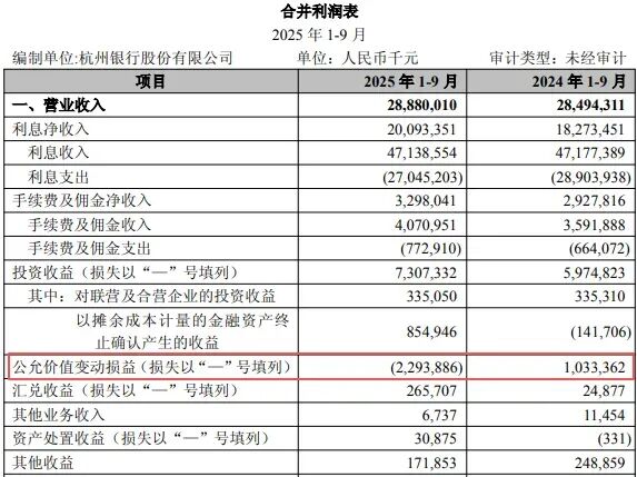 从2025年三季报来看,利息净收入同比增长9.96%至200.93亿元,手续费及佣金净收入同比增长12.65%至32.98亿元,投资收益同比增长22.3%至73.07亿元,均保持较快增长速度,拖累总营收下降的是公允价值变动损益,前三季度为-22.94亿元,2024年同期为10.33亿元,由正转负,两年相差33亿元左右。