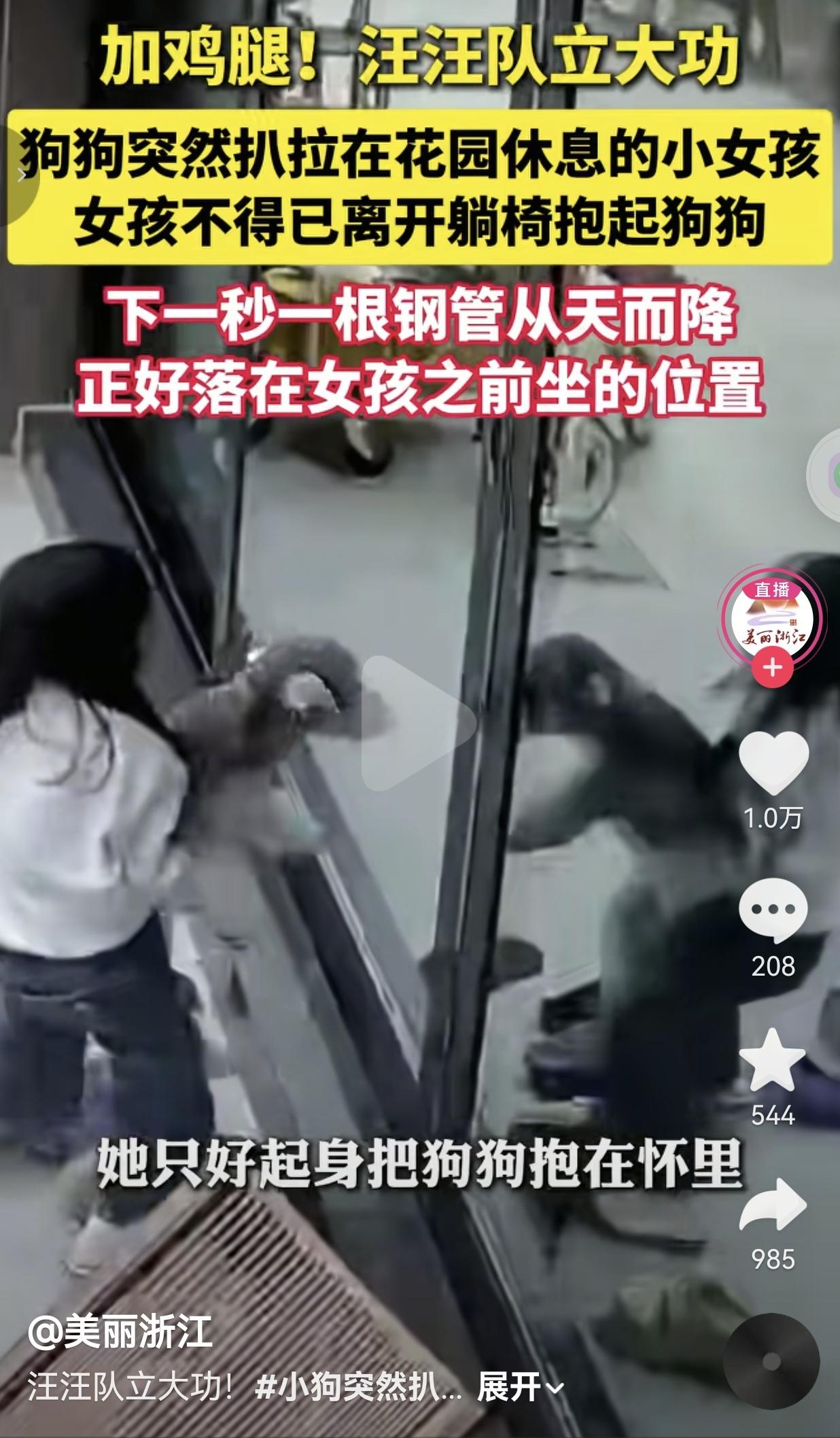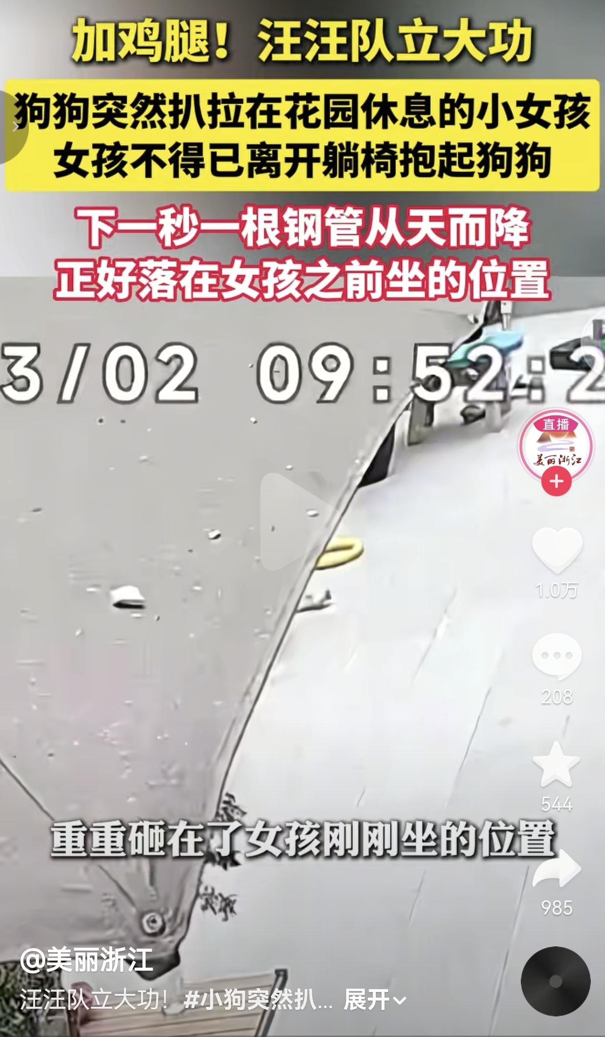 万物皆有灵!这小狗立下大功了!3月2日,重庆,一个普通的上午,小女孩像往常一样,窝在自家花园的躺椅上刷手机。 阳光洒在小女孩的身上,晒得暖乎乎的,她完全沉浸在自己的小世界里,连身边的小狗都没太在意。 可是,这只小狗,今天明显有点不太对劲。 因为,平时一喊名字就乖乖坐进怀里撒娇,反而从花园另一头疯跑过来,围着小女孩的腿不停地扒拉、打转,还一个劲儿地往玻璃门的方向瞅,眼神里全是焦急。 “这狗今天咋了?”小女孩有点懵,喊了它好几声名字,它还是不依不饶,就是不肯安静下来。 没办法,她只好起身,想把这只“闹脾气”的小狗抱进怀里安抚一下。 可谁能想到,就在她离开躺椅的那几秒钟,“哐当”一声巨响,一根钢管从天而降,结结实实地砸在了她刚才坐着的地方! 从监控画面里可以看出,那根钢管砸在躺椅上的瞬间,连地面都震了一下,看得人后背发凉。 我想如果小狗没有扒拉她,如果她晚一秒起身,后果真的不堪设想。 事后妈妈说,那根钢管是楼上施工时不小心掉下来的。平时狗狗都黏在女儿身上,唯独那天,它反常得厉害,怎么叫都不坐,就是一门心思要把女儿从椅子上“弄走”。 网友看到后评论道:“这哪是狗啊,这是家里的小守护神!” 也有的网友说:“必须加鸡腿!还得是最大的那种!” 还有的网友说:“我家狗只会拆家,这狗是来报恩的吧?” 说实话,我看完监控视频,再看到这张喂饭的照片,鸡皮疙瘩都起来了。 我们总说狗狗是人类最好的朋友,但很多时候,我们还是把它们当成宠物,当成陪伴。可在生死关头,它们用自己的方式,给了我们最纯粹、最本能的守护。 虽然它们不会说话,却能用行动告诉你:“别怕,有我在。” 通过这件事也给我们敲了个警钟:高空坠物的危险,从来都不是遥远的新闻。它可能就藏在我们头顶的每一栋楼里,每一次不经意的疏忽,都可能酿成无法挽回的悲剧。 而我们身边的这些毛孩子,它们的直觉和忠诚,有时候比我们更敏锐,也更可靠。 所以,下次当你家的狗狗突然变得反常,别先急着生气,也许它是在拼命地提醒你:危险正在向你慢慢靠近,你需要注意。 针对此事,你有什么看法呢?欢迎大家评论区讨论留言。