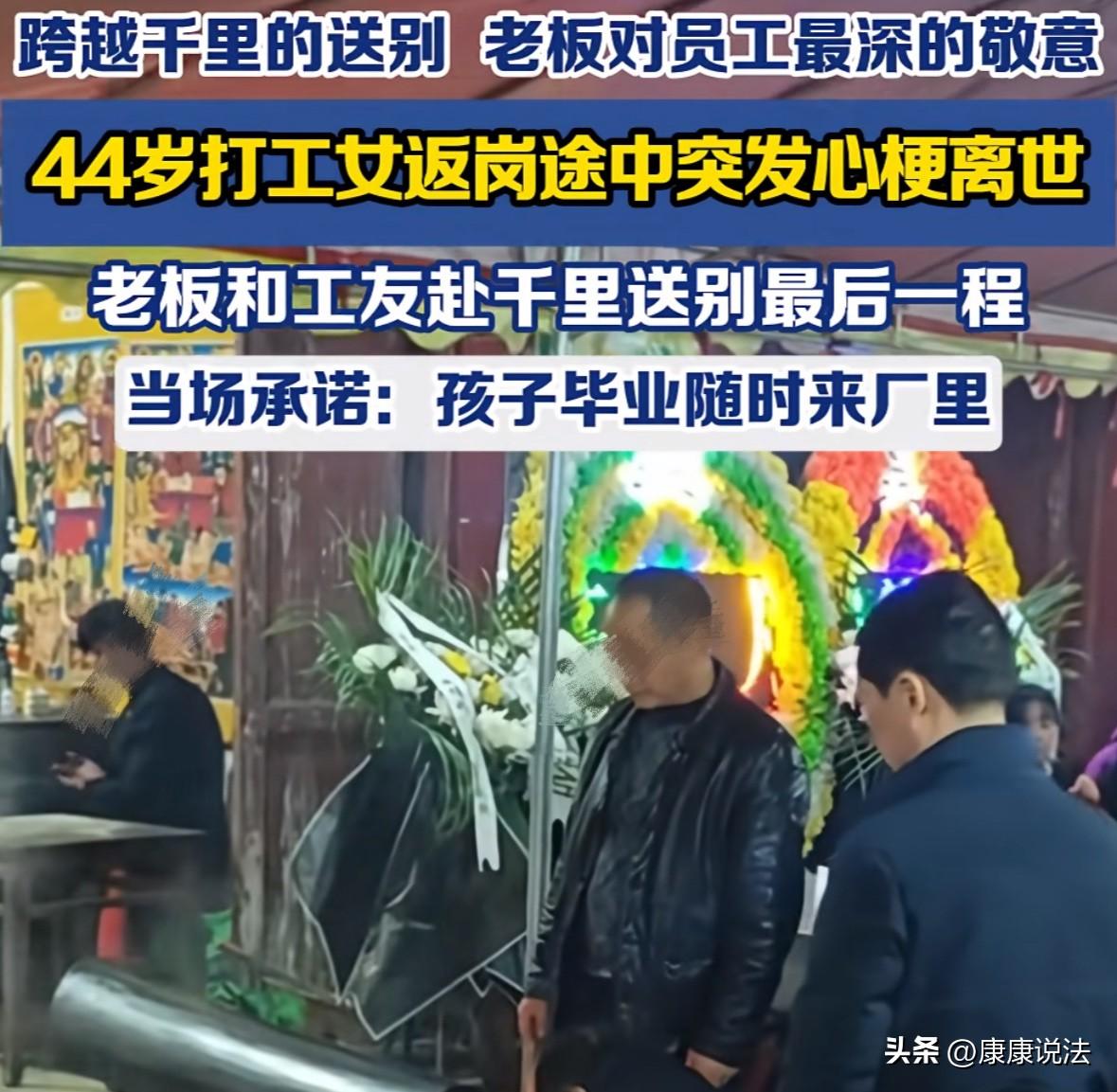 这老板,不发财,天理难容!贵州一女子,大年初七在返程复工的路上,突发心梗离世,年仅44岁。老板得知后,立刻带了几位同事从广东坐飞机、包车,又冒雨走了两个多小时的山路赶到村里,送女子最后一程。临走时,老板留下了3万块的抚恤金,和厂子里30多名员工的捐款,并向女子正在上高中的女儿承诺:大学毕业了,随时来厂里工作。网友纷纷高呼:有情有义的好老板。 如今,为了生计,背井离乡的年轻人多不胜数,练女士就是其中一个。 为了养家糊口,她从贵州老家奔赴至一千公里外的广东务工,为了把钱攒下来,给孩子和老人提供更好的生活条件,练女士每年也就春节回来一次,和老人还有孩子,相处不过十天。 每次返程时,总是有太多的不舍,可成年人的世界,哪有“既要又要”一说,想要挣更多的钱,就要舍弃些和家人相处的时间。 这不,今年大年初七,春节的热闹劲儿还没完全消散,练女士就要返程回广东上班了。 临走了,爸妈给她带了很多特产和年货,叮嘱她,工作再忙,也不能亏待自己的身子,要多吃点好的,女儿也依依不舍,和她拥抱后,不得不挥手再见。 从后视镜里看着逐渐模糊的家人的身影,练女士心想,趁身体尚可,再干几年,攒够钱,就回老家守着父母和孩子好好过日子,弥补这么多年对他们的亏欠。 可谁能想到,命运却在这时候跟她开了个残酷的玩笑。 在高速上行驶了不到一半的路程,练女士突然感到胸口一阵剧痛,紧接着就失去了意识,同行的伙伴急忙拨打急救电话,但最终还是没能挽回她的生命。 练女士最终因突发心梗永远地离开了这个世界。 面对这个悲痛的消息,练女士的家人心里凉透了,尤其是父母,白发人送黑发人的苦楚,难以言表。 不过,就在练女士一家人最悲伤无助的时候,一个温暖的身影出现了。 练女士所在工厂的领导胡老板,得知这个噩耗时,整个人都呆住了,心里满是悲痛和惋惜。因为练女士是厂子里不可多得的好员工,为人踏实,工作兢兢业业,年年都是厂里的优秀员工。 胡老板随即决定,要亲自去送练女士最后一程。他叫上了几个和练女士关系不错的同事,一行人匆匆忙忙地从广东出发。 他们先坐飞机到遵义,又包车到镇上,一路上舟车劳顿。 然而天气也不给力,下起了雨,山路又不好走,于是他们一行人又冒雨前行,背着给女子家人准备的心意,深一脚浅一脚地在山路上走了两个多小时,才到练女士家中。 村里前来吊唁的亲朋好友,看到胡老板和同事们远道而来,感动得热泪盈眶。纷纷称,这是一位好老板,重情义。 抵达葬礼现场后,胡老板紧紧握着女子丈夫的手,安慰他要节哀,接着走完了吊唁的所有流程,眼里满含泪水。 临走时,胡老板从兜里拿出一个信封,里面装着3万块钱的抚恤金。他把信封递给女子的丈夫,说:“这是厂里的一点心意,希望能帮你们渡过这个难关。” 然后,又从公文包里掏出另一个信封,里面是厂里30多名员工的捐款,一并交给了女子的家人。 最后,胡老板还当众向练女士的女儿承诺说:“孩子,你好好读书,等大学毕业了,随时来厂里工作,叔叔一定给你安排好。”小姑娘听了,眼中闪烁着泪花,用力地点了点头。 网友们纷纷高呼:“这老板,不发财,天理难容!” 大家都觉得,在这个物欲横流的社会里,像这样有情有义的好老板,实在是太难得啦! 《工伤保险条例》第15条规定:视同工伤需同时满足工作时间+工作岗位+突发疾病48小时内死亡,通勤途中不属于“工作岗位”,一般不适用。 也就是说,厂里没有责任对练女士的死亡负责,胡老板和同事吊唁及捐款的举动,纯属人道主义,老板的做法尽显善良和担当。 从社会层面,老板的行为树立了好榜样。在当今社会,部分企业与员工关系较为淡漠,而此老板的做法让人们看到,企业与员工可以是有情有义的共同体。 对此,你怎么看!