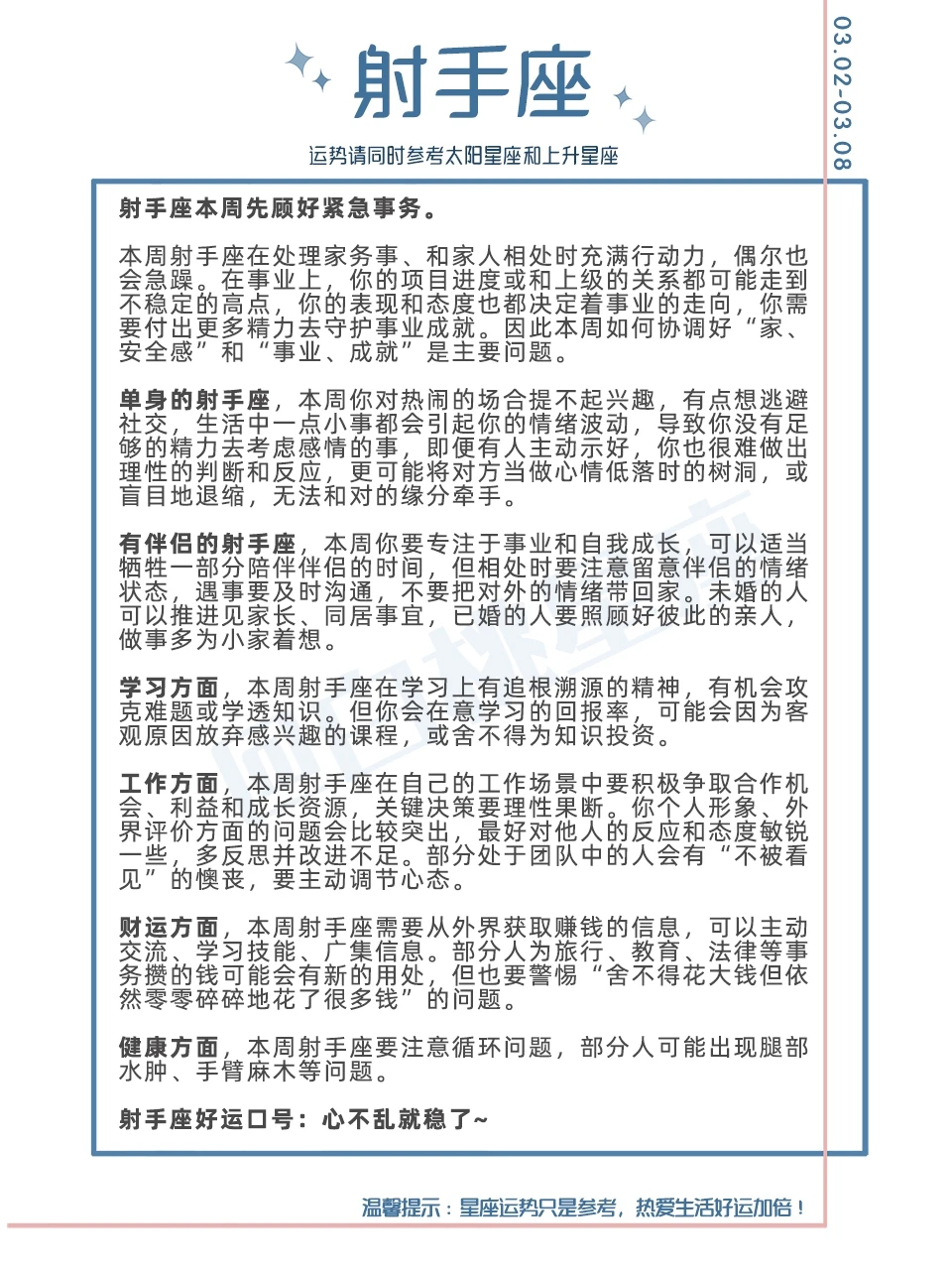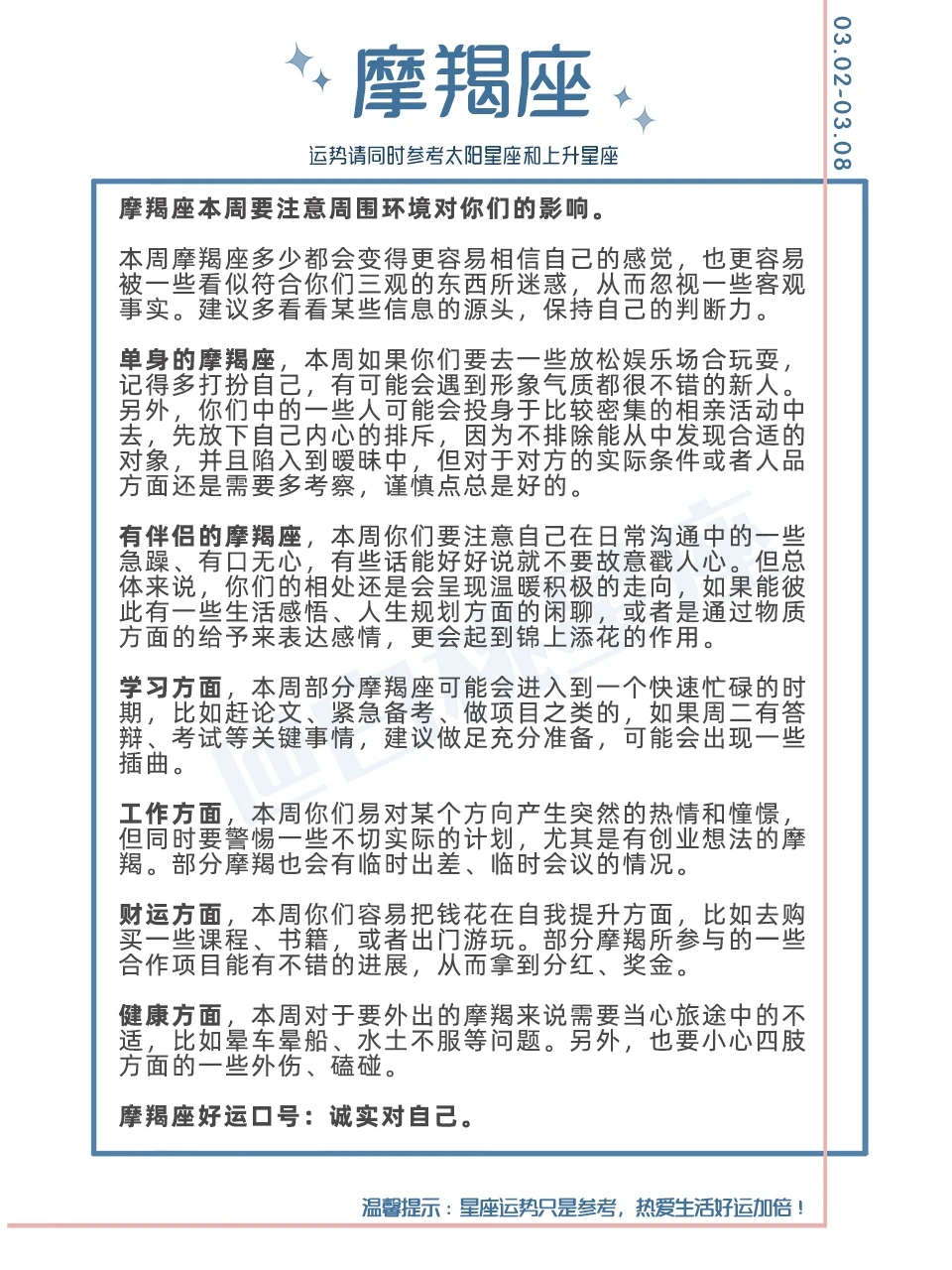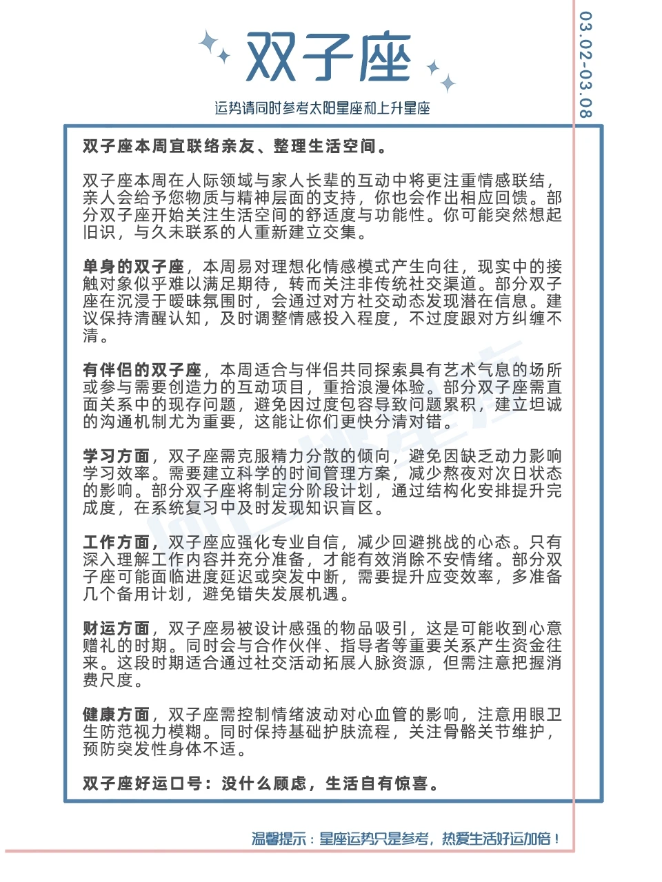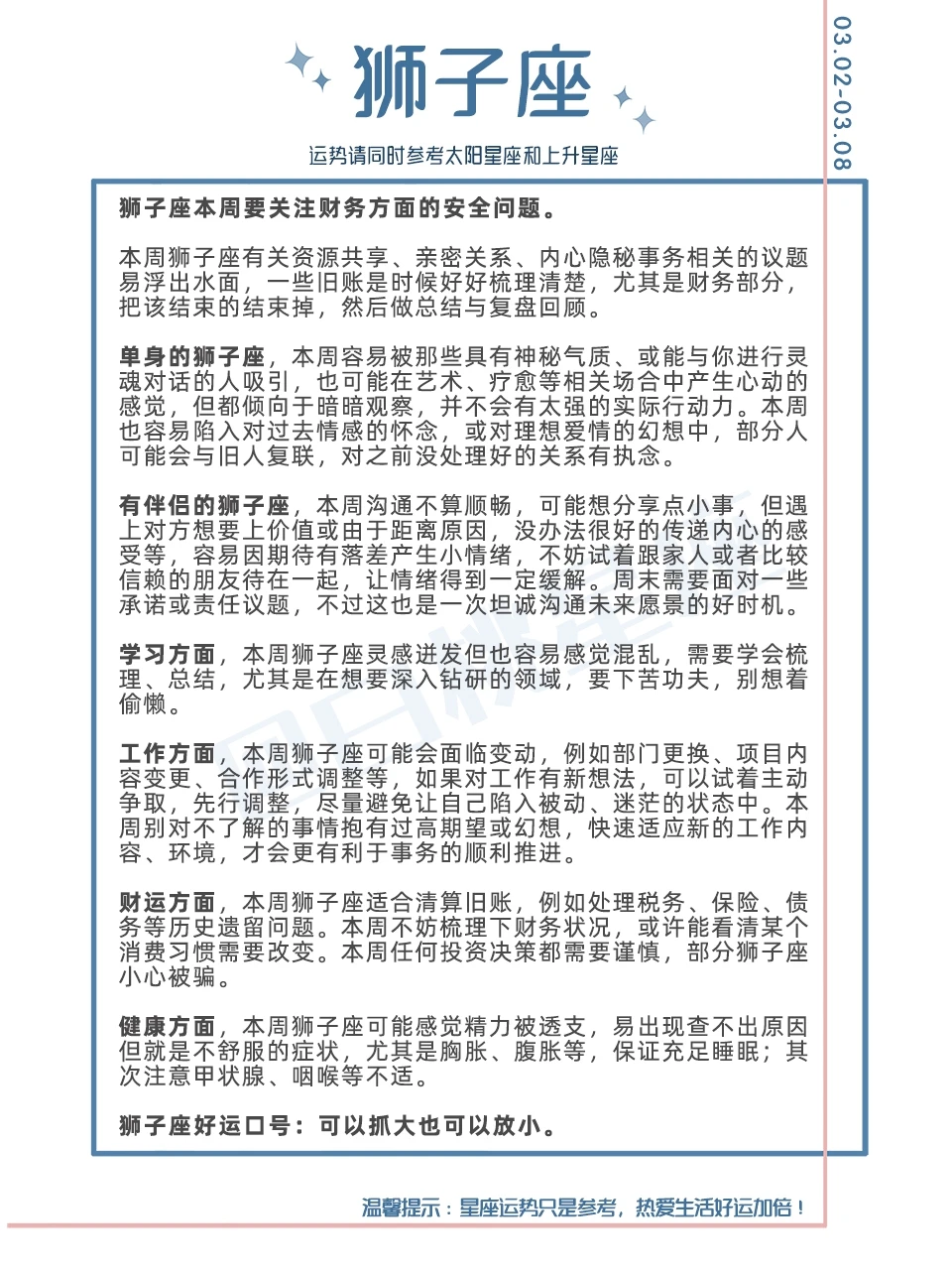 温馨提示:星座运势只是参考,热爱生活好运加倍!