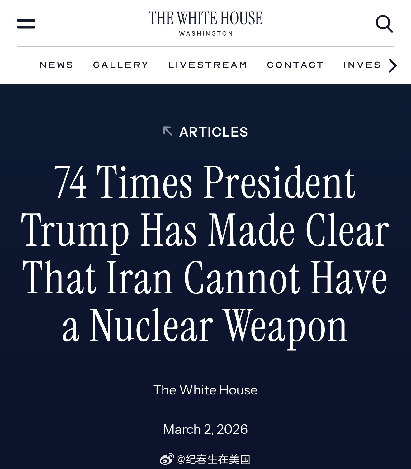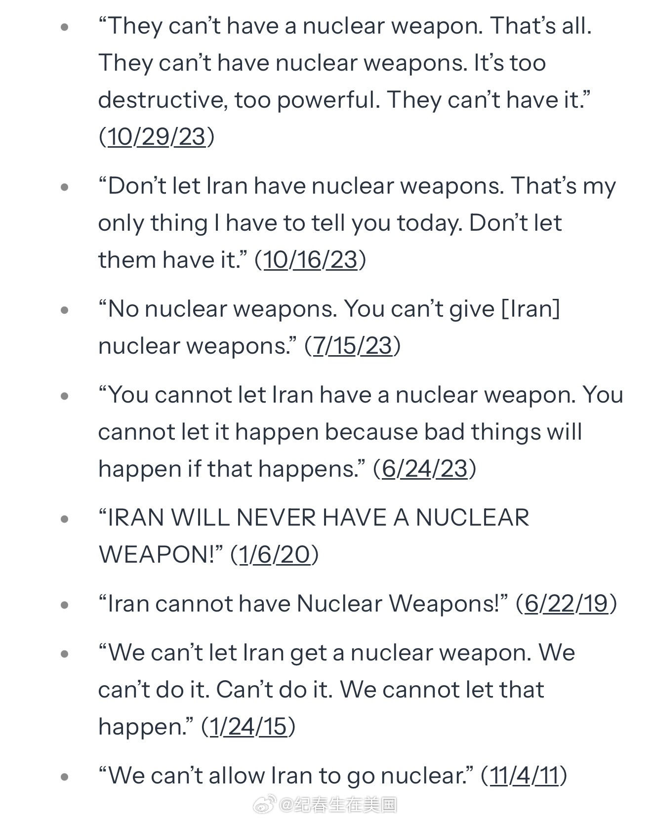 白宫做了个网页,列出了川普从2011年以来74次表态绝不允许伊朗获得核武器的言论