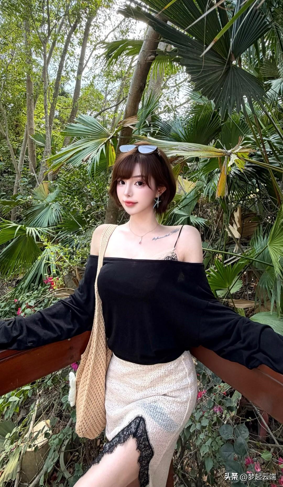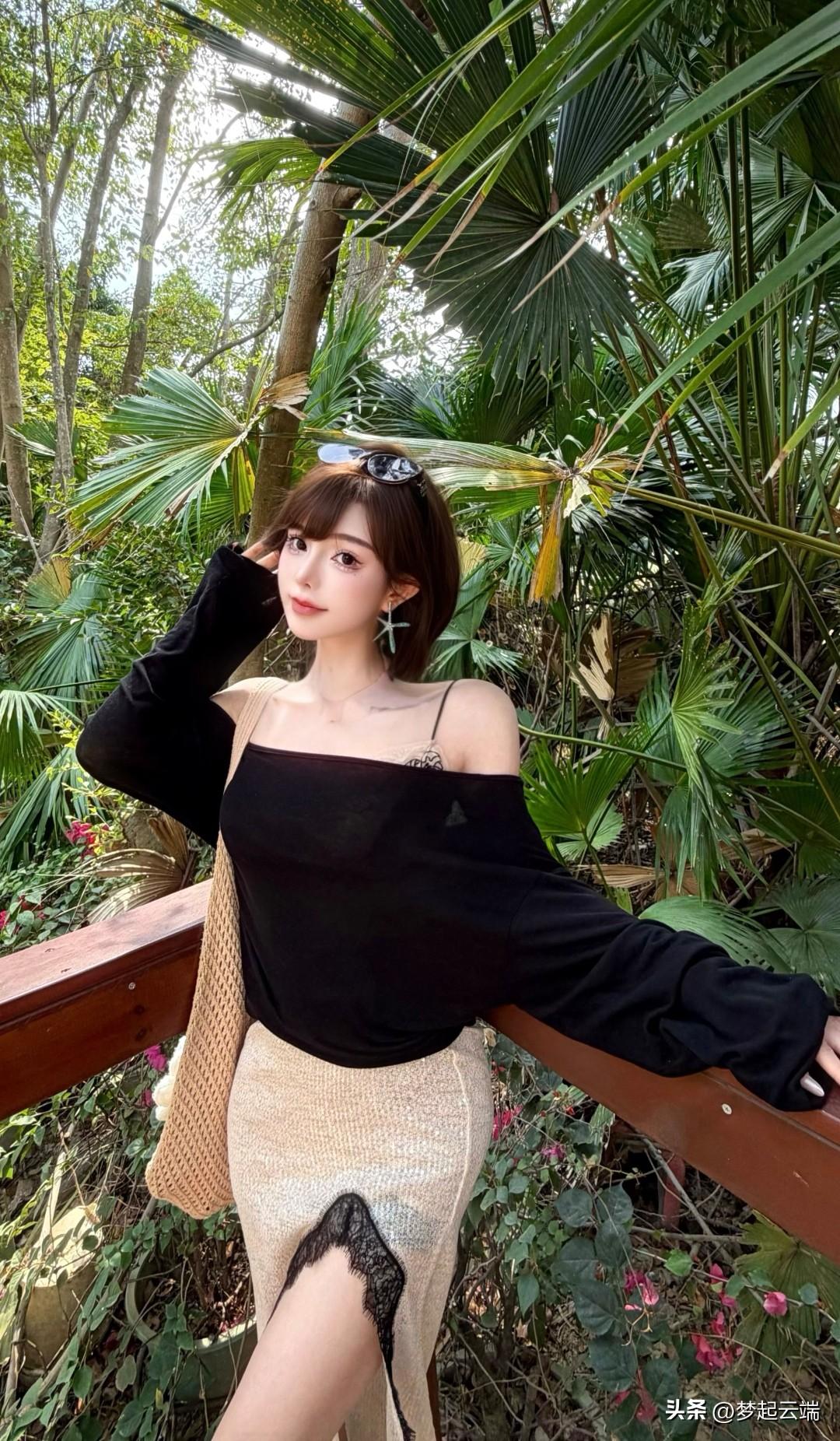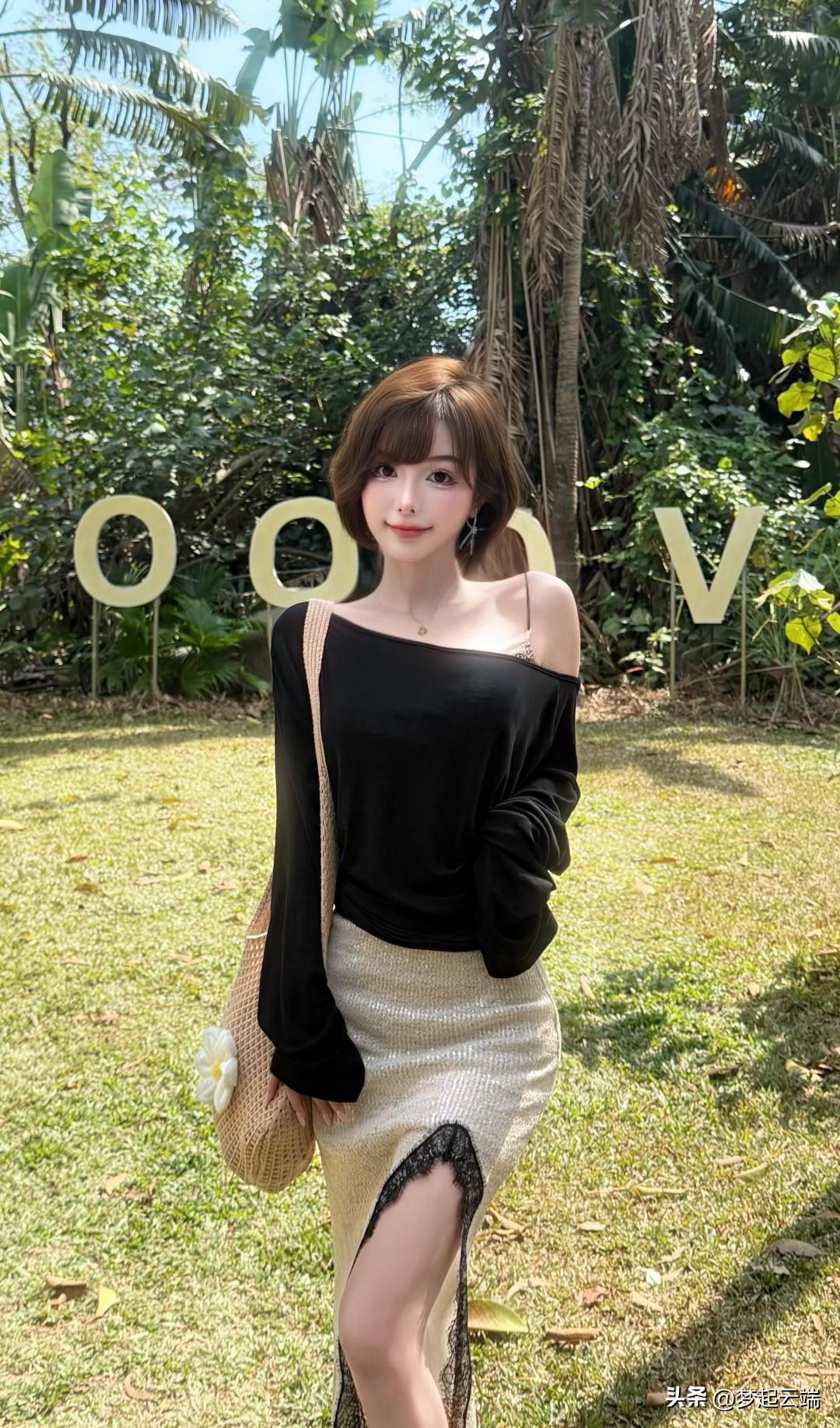 黑色露肩上衣搭配米色长裙,清新自然,尽显夏日风情!🌞👗💃