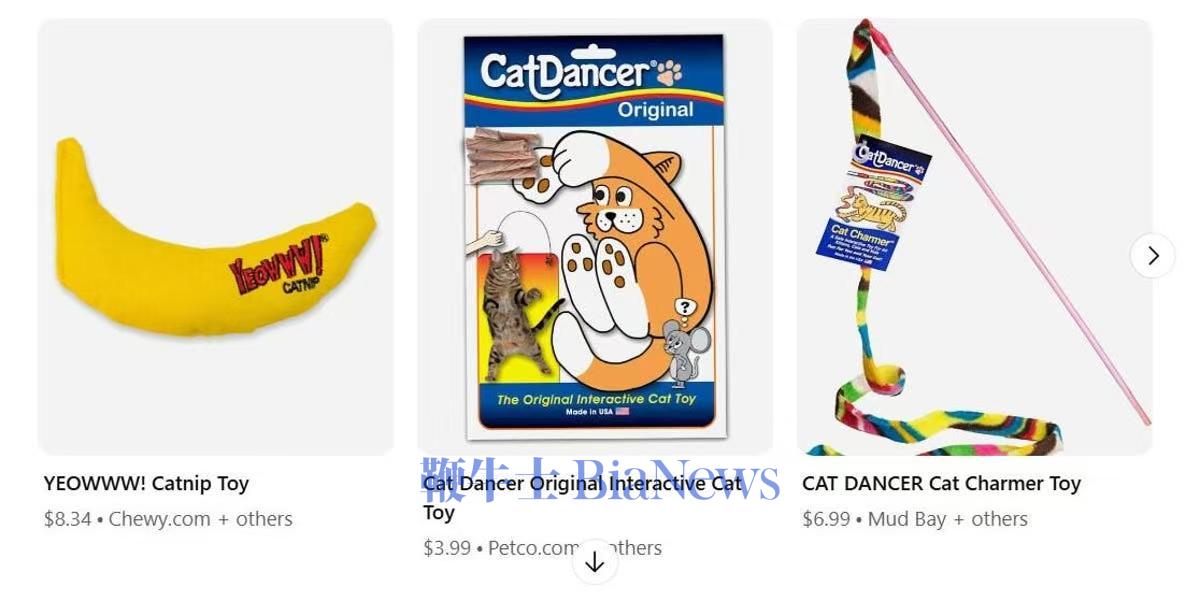 OpenAI的ChatGPT已经具备AI购物搜索功能。我试用了一下,问:“请推荐一些最好的猫玩具。”AI回复了我一份精选的高评分猫玩具清单。它以横向可滚动的轮播图形式展示了产品;每个产品都显示了不同商店的价格。和Meta一样,你需要点击每个产品对应的商店网站链接才能购买。