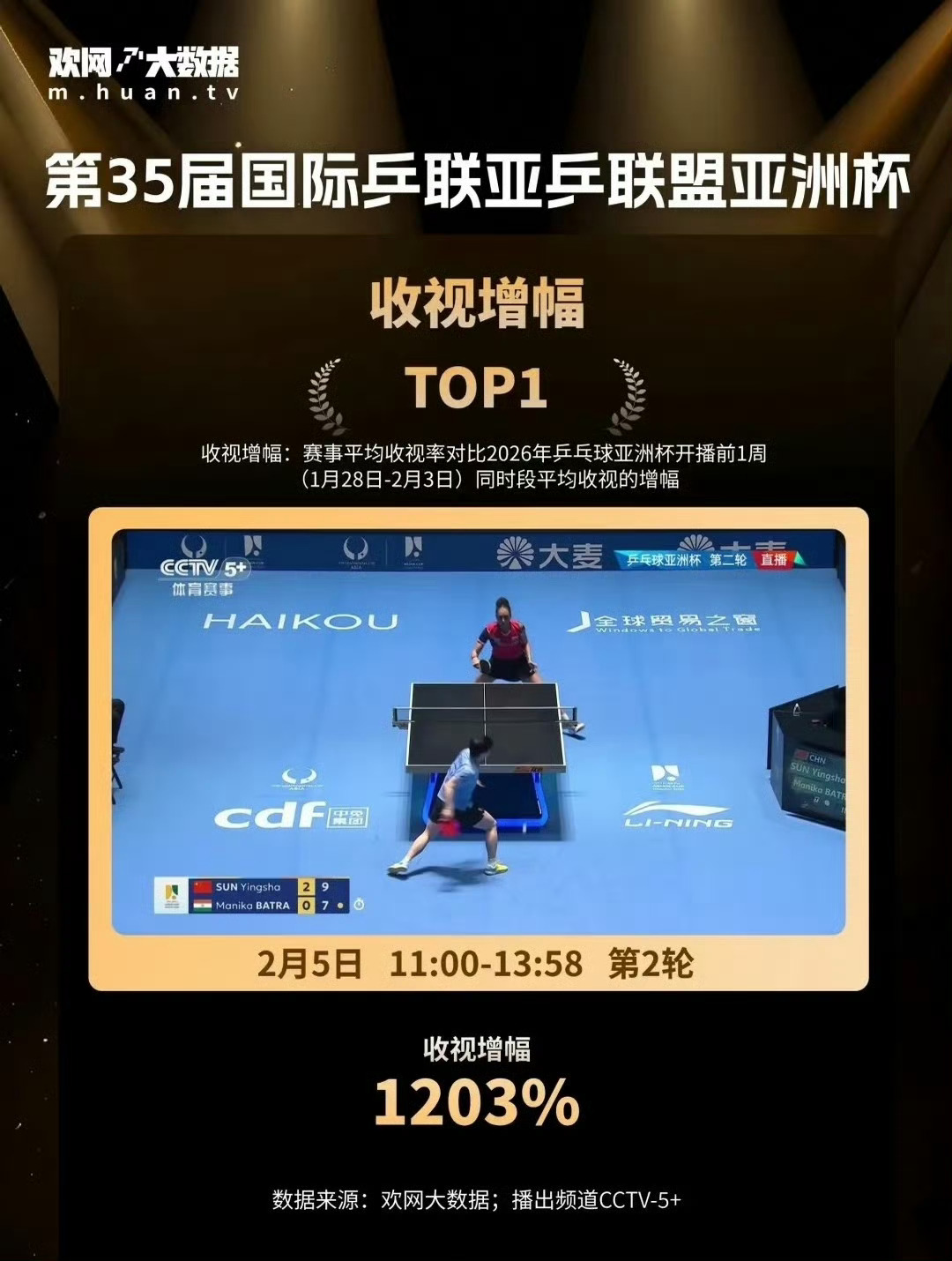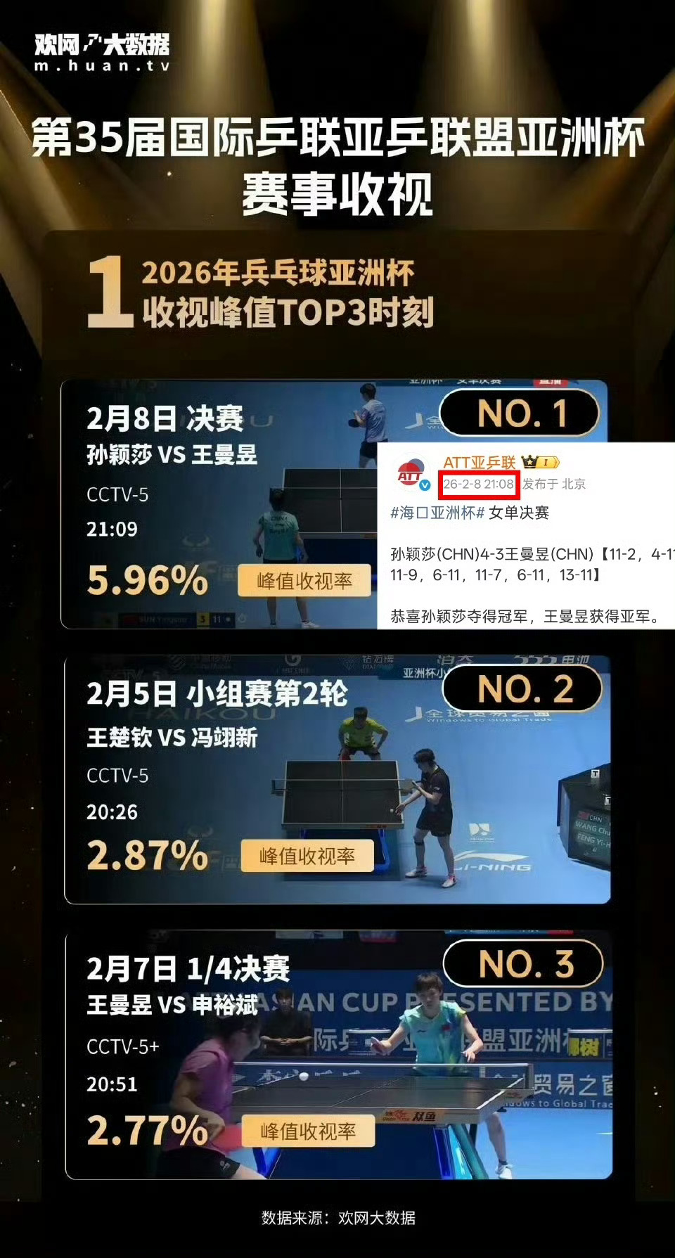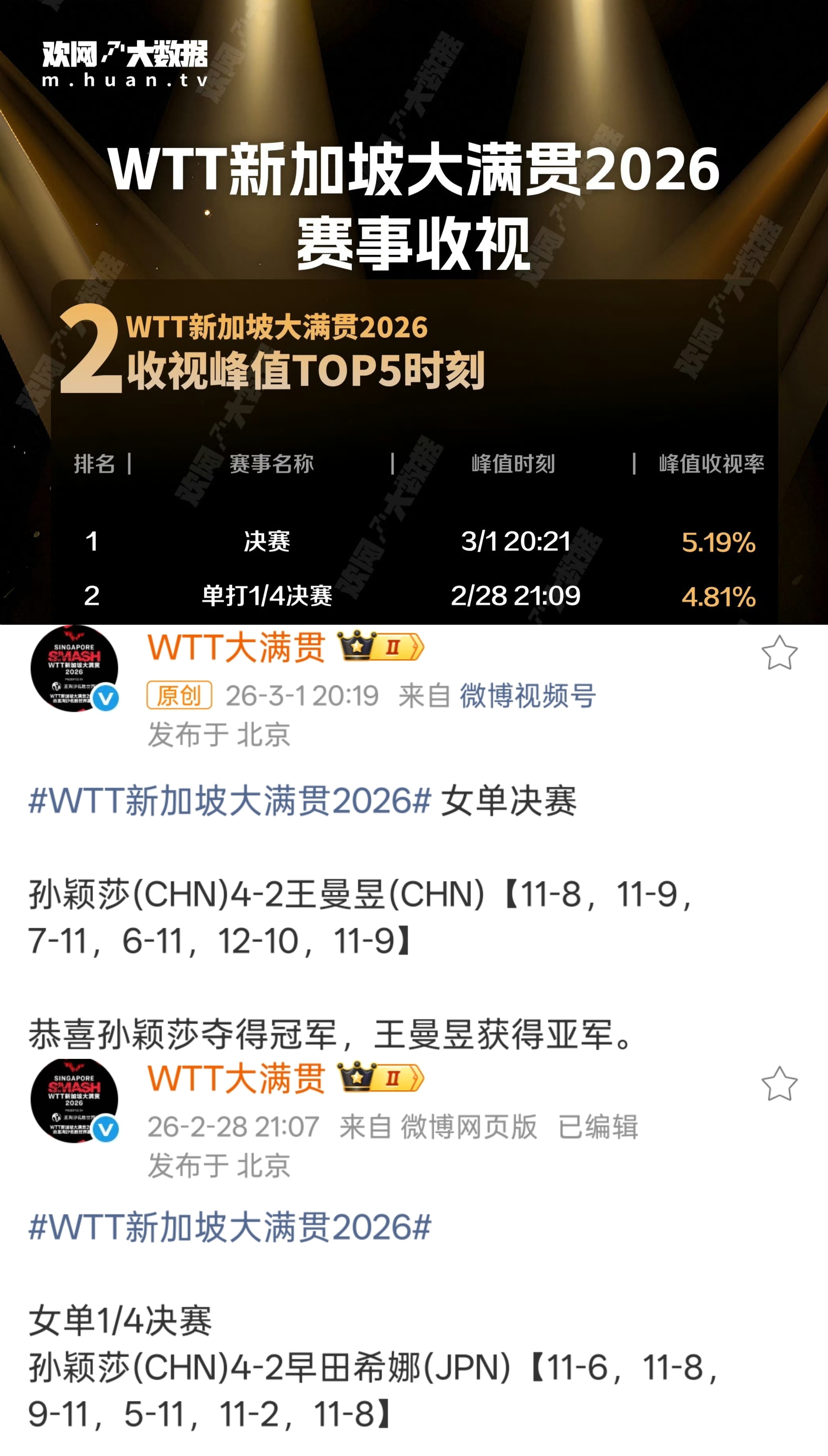 2026孙颖莎强势回归两站连冠收视🔥🔥🔥1️⃣ITTF-ATTU2026海口亚洲杯赛事收视TOP1🏆:2月8日女单决赛【孙颖莎4–3王曼昱】 收视峰值5.96%🔥2️⃣WTT2026新加坡大满贯赛事收视TOP1🏆:3月1日女单决赛【孙颖莎4–2王曼昱】 收视峰值5.19%🔥 赛事收视TOP2:2月28日女单1/4决赛【孙颖莎4–2早田希娜】收视峰值4.81%🔥