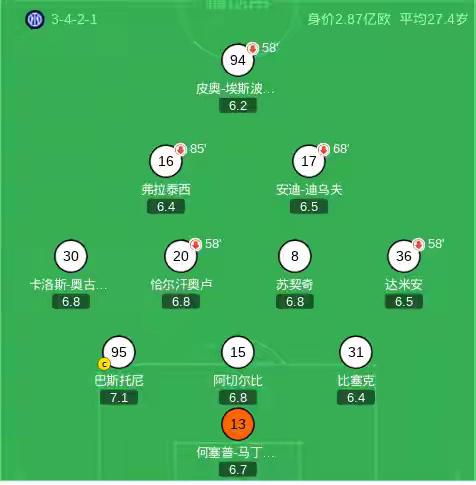 零进球也无碍目标!意大利杯半决赛首回合国际米兰客场0:0战平科莫,这是齐沃治下首场没有进球的平局,也是齐沃治下唯二的平局(另一场为联赛主场2:2战平那不勒斯)。首回合没有占得先机,期待在次回合回到主场国际米兰能战胜对手进而踏入决赛。 由于闹前锋荒(劳塔罗和博尼伤缺),同时为了应对周末的米兰德比,国际米兰执行大幅轮换和变阵3421。变阵后的国际米兰进攻效率明显低下,全场国际米兰射门寥寥仅有3次射门,但防守在线,一场0:0无碍国际米兰双线争冠的目标。 期待主力得到休息的国际米兰在周末的米兰德比上有出彩的表现,全力取胜,以进一步拉开积分差距,为迈向第21冠加足马力。