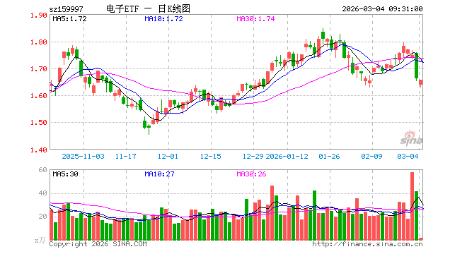 3月4日,电子ETF(159997)开盘跌1.44%,报1.637元。电子ETF(159997)重仓股方面,立讯精密开盘跌1.52%,寒武纪跌0.98%,工业富联跌1.64%,中芯国际跌0.91%,海光信息跌1.67%,北方华创跌0.66%,胜宏科技跌1.37%,京东方A跌0.69%,兆易创新涨0.00%,澜起科技跌0.60%。
