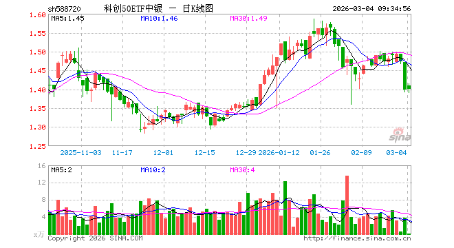 3月4日,科创50ETF中银(588720)开盘涨0.86%,报1.410元。科创50ETF中银(588720)重仓股方面,中芯国际开盘跌0.91%,寒武纪跌0.98%,海光信息跌1.67%,澜起科技跌0.60%,中微公司跌1.35%,金山办公跌0.97%,联影医疗跌0.65%,拓荆科技跌0.14%,芯原股份跌3.64%,沪硅产业跌0.71%。
