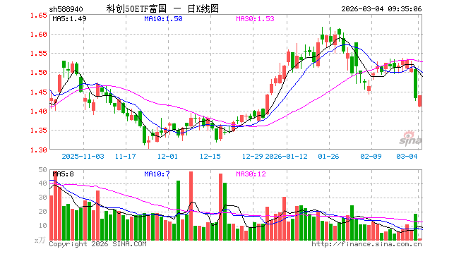 3月4日,科创50ETF富国(588940)开盘跌1.54%,报1.411元。科创50ETF富国(588940)重仓股方面,中芯国际开盘跌0.91%,寒武纪跌0.98%,海光信息跌1.67%,澜起科技跌0.60%,中微公司跌1.35%,金山办公跌0.97%,联影医疗跌0.65%,拓荆科技跌0.14%,芯原股份跌3.64%,沪硅产业跌0.71%。