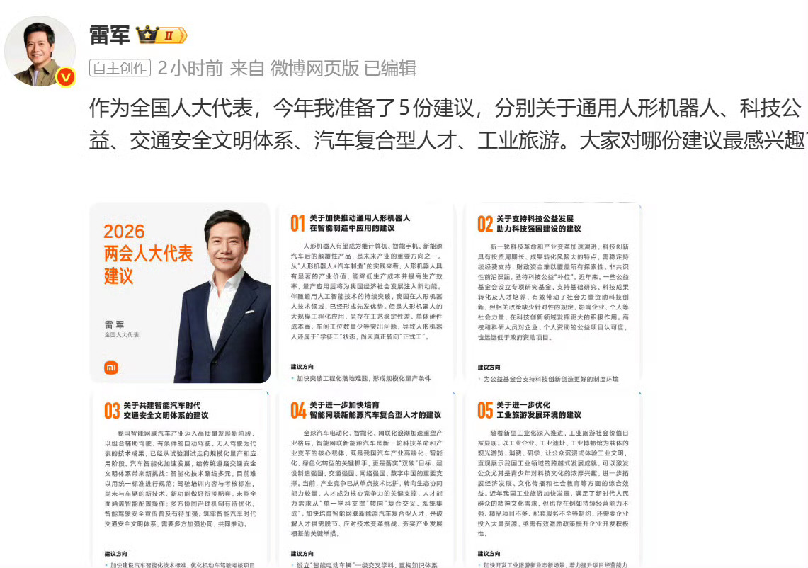雷军2026两会准备5份建议雷总为两会带来5份建议,聚焦人工智能与产业升级,针对人形机器人提出加快突破工程化难题,推动从“学徒工”向“正式工”转变,力争2027年实现特定场景无故障工作时间突破1万小时,在智能汽车领域,建议将智驾操作纳入驾考,同时关注培育百万复合型人才及发展工业旅游。