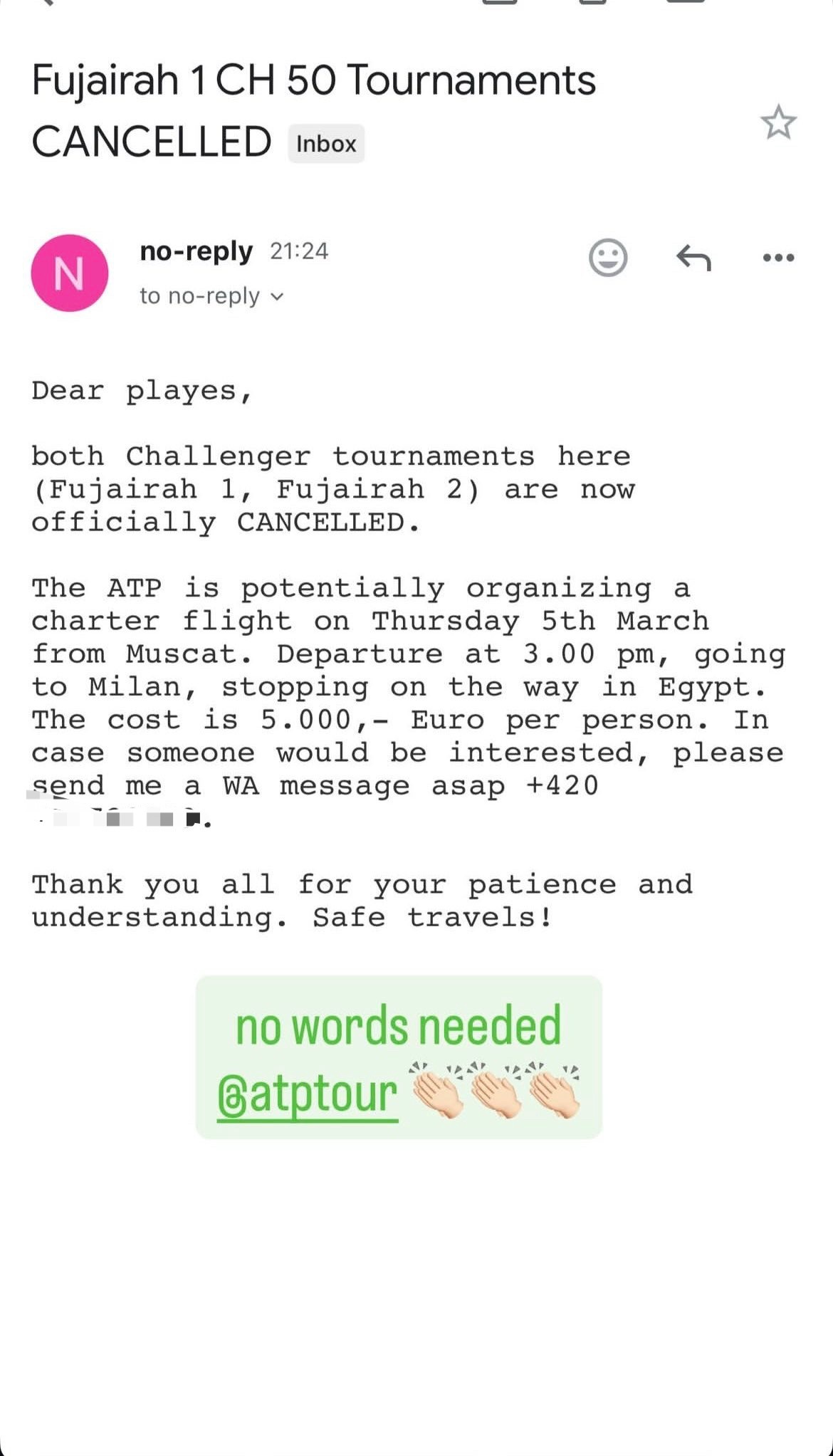 ATP发邮件通知球员:取消在阿联酋富吉拉举办的两站挑战赛,可能会组织协调专机3月5日从阿曼飞米兰(经停埃及)。但滞留当地的人员如果想预订座位,需要每人支付5000美元。PTPA发布公告,说愿意为每位滞留球员提供2500美元的资金,并且呼吁ATP承担剩下的2500美元。对此你怎么看?网球体育大赏