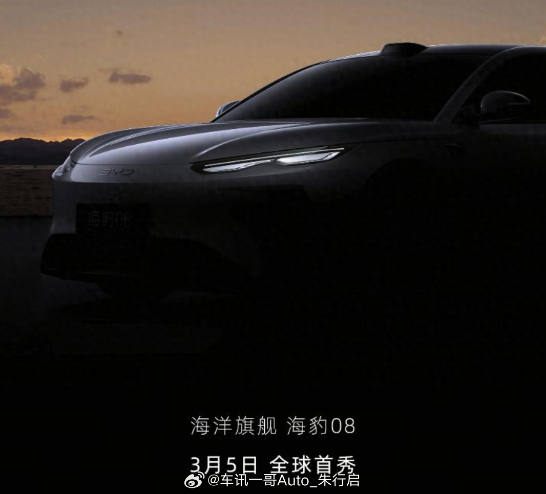 比亚迪海洋网发布海豹08的预告图,新车将于3月5日首发亮相。新车预计定位中大型车