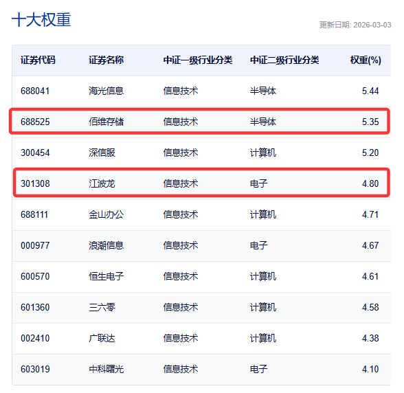 截至3月3日,佰维存储在信创ETF汇添富(560850)标的指数中的权重高达5.35%,是指数的第二大权重股!权重甚至远高于部分芯片类指数!
