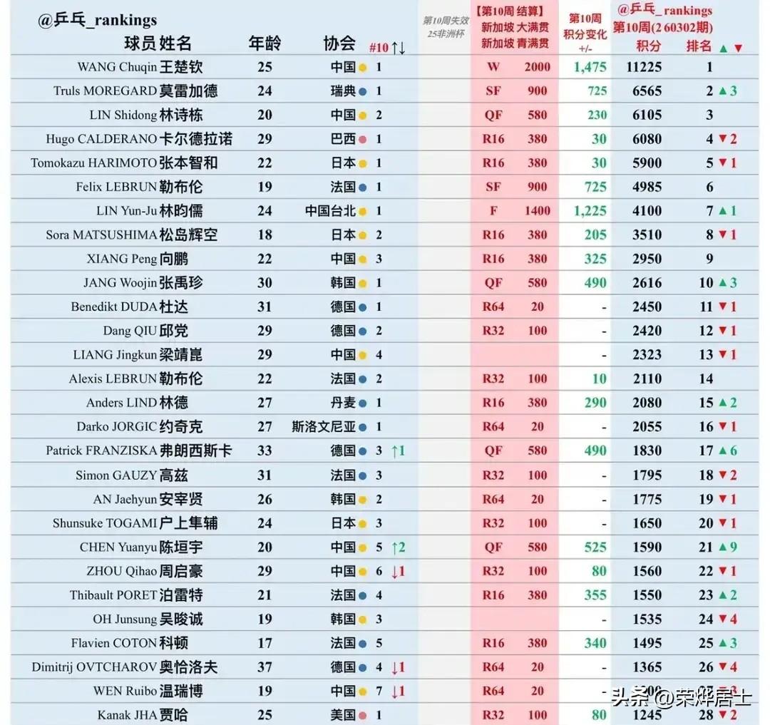 从最新乒乓球排名来看, 改变世界排名的不是新加坡大满贯, 王楚钦对战林昀儒的决赛, 因为大头依然是第一! 也不是陈垣宇爆冷雨果, 雨果虽然退步两名, 仍然是四号种子! 而是弗朗西斯卡爆冷张本智和, 这让张本智和直接掉出前四种子位, 而弗朗西斯卡升了6名, 直接进入世界前20。