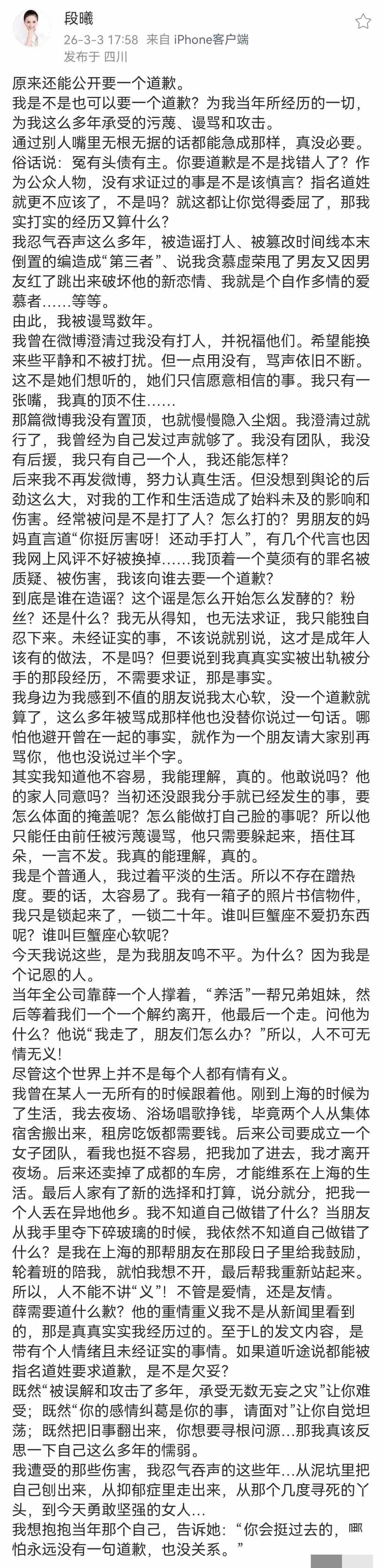 张杰前女友段曦猛锤! 十二年冤屈终爆发, 谁的体面碎了一地? 谢娜为张杰怒怼薛之谦,反倒炸出段曦的千字血泪控诉,这波反转属实惊掉下巴! 谁能想到当年那个被骂第三者、打女人的段曦,竟是被篡改时间线、背了十二年黑锅的受害者?她陪张杰苦熬日子,卖车卖房养家,最后被弃还遭网暴丢代言,而张杰的沉默,远比出轨的指控更伤人。 最讽刺的是,谢娜喊着要薛之谦为莫须有的伤害道歉,却忘了自己身边人,从未给段曦一句澄清。明星的体面,不该是建立在别人的委屈之上,沉默从来不是体面,是逃避责任。这场罗生门,看似是感情纠葛,实则是人性的照妖镜,谁在说谎,谁在装无辜,群众的眼睛从不是瞎的。 你觉得这场风波里,最该被讨一个道歉的人,到底是谁?