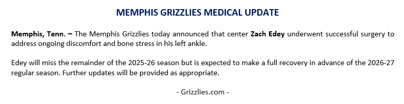 孟菲斯灰熊队今日宣布,中锋扎克-埃迪已成功接受手术,以解决其左脚踝持续的不适和骨骼应力问题。