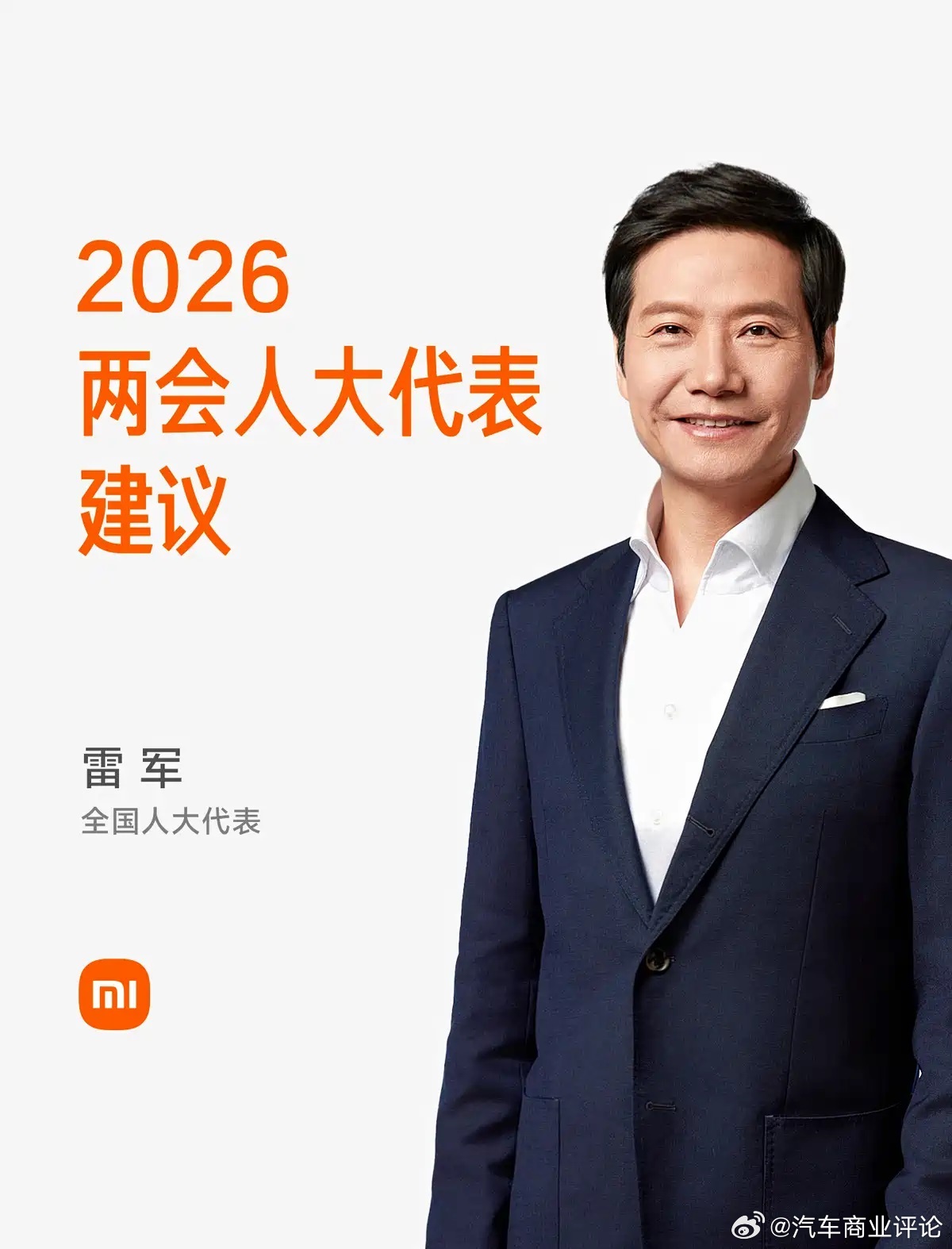 雷军两会建议 3月4日,雷军在公众号上发布了《雷军:我的2026两会建议》。雷军在通用人形机器人智能制造、支持科技公益发展、智能汽车交通安全文明体系、智能网联新能源汽车复合型人才、工业旅游发展环境提出了建议。