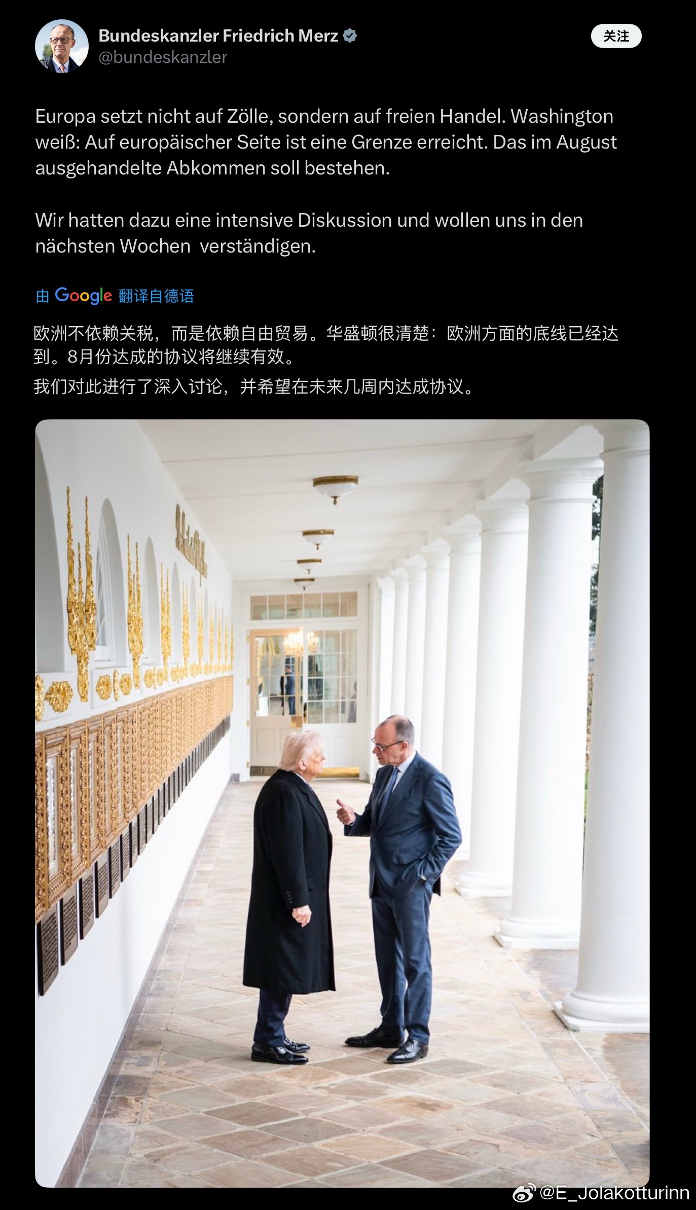 同一角度下白宫发的特朗普与默茨谈话视频截图 VS 默茨自己发的与特朗普的合照。