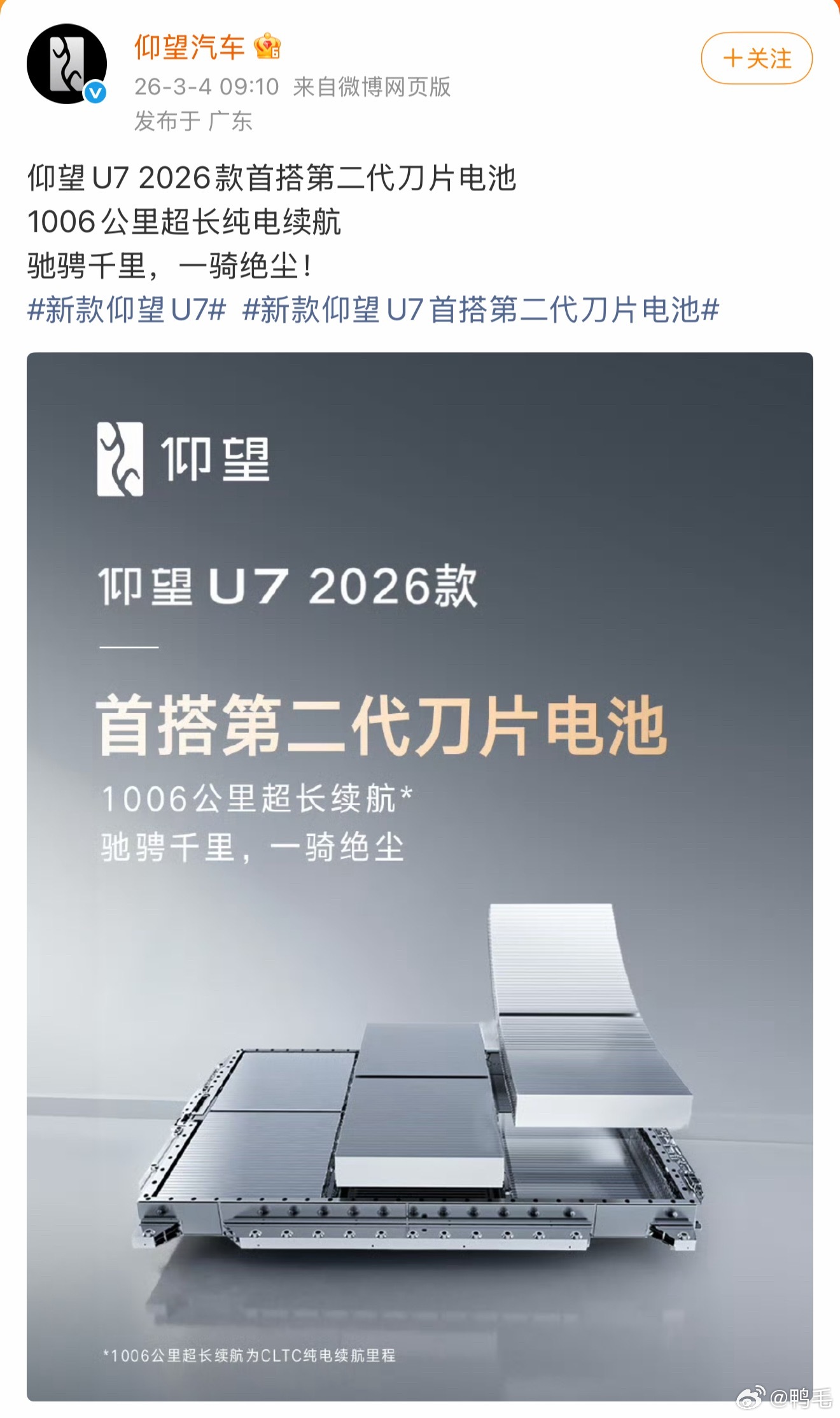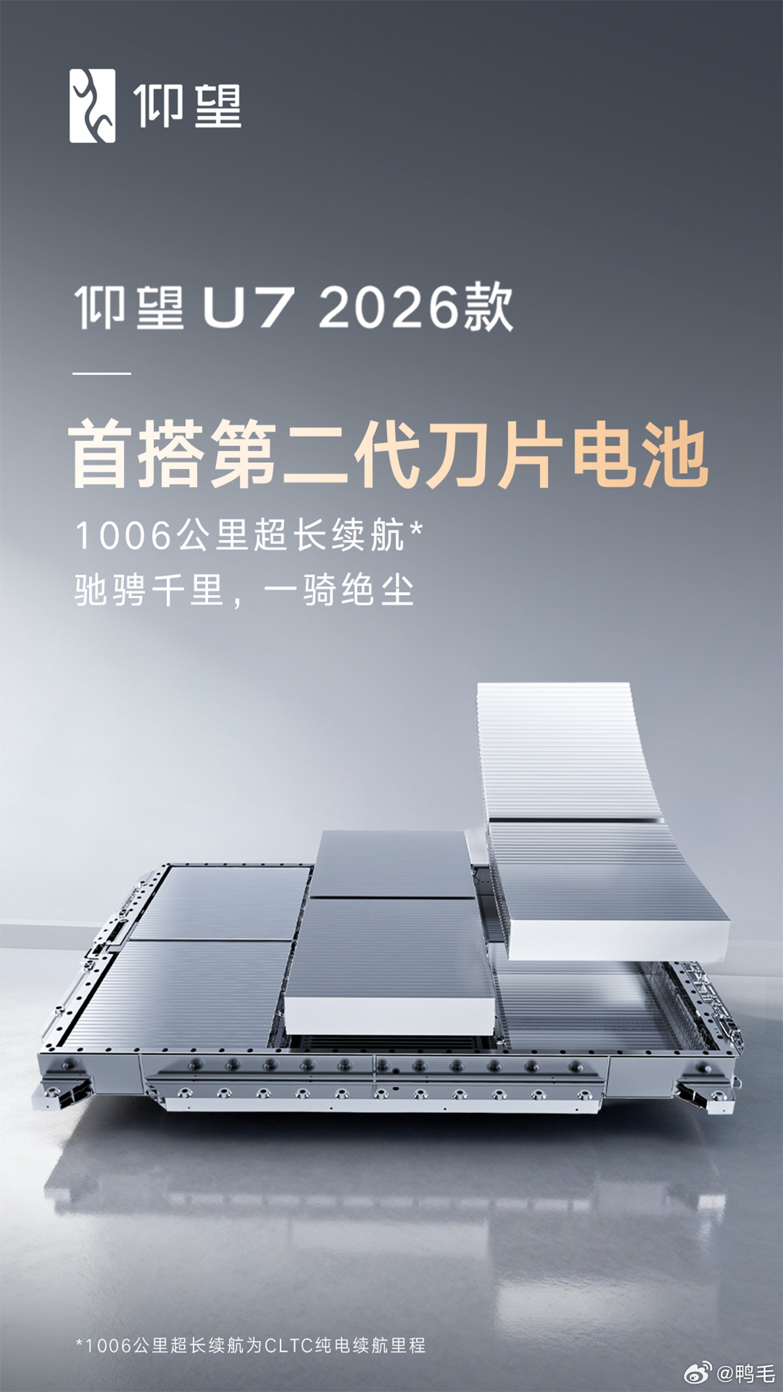 仰望U7 2026款首搭第二代刀片电池,150度电,CLTC续航干到1006公里。更关键的是,它同时撑起了四电机960kW的满功率输出,1300多匹马力,零百2.9秒。日常开能过千公里,想爽一把的时候性能也在那儿。