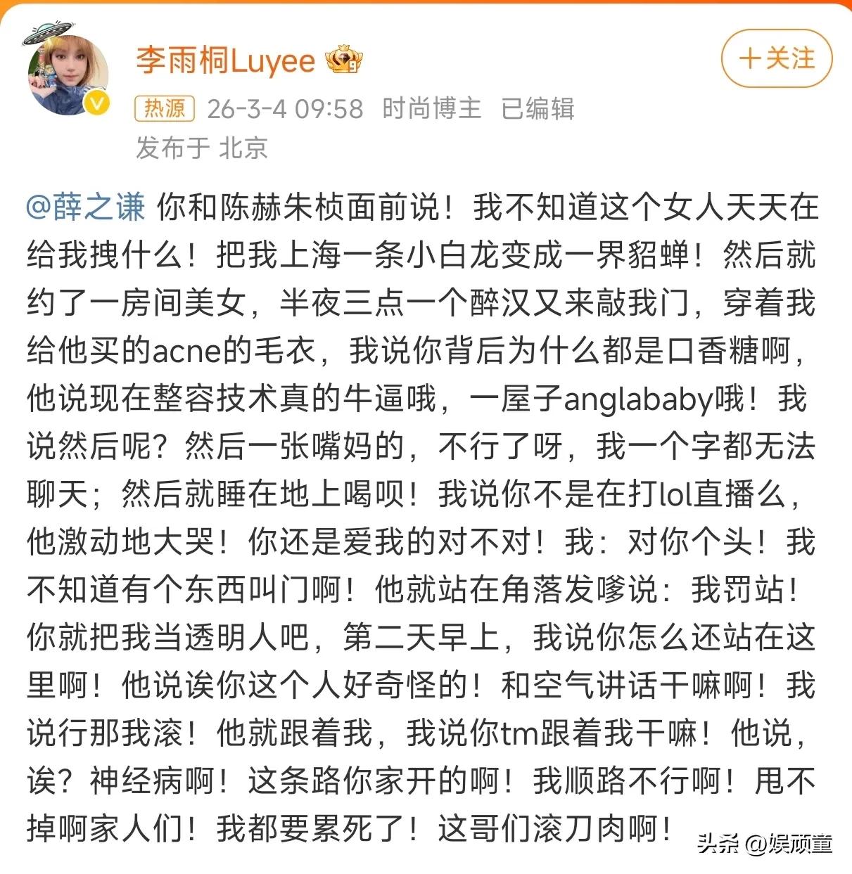 从李雨桐的发文,基本上可以确定一件事! 薛之谦的“癫”不是演的,是真的! 薛之谦除了唱歌时候是正常的,其他时间,尤其是说话时候,给人的感觉就是找不到北,或者可以形容为想到哪里说到哪里,有一些无厘头,甚至是冷笑话既视感! 一直以为这是薛之谦的人设,如今从李雨桐的爆料,以及薛之谦被扒出的过往来看,这就是他自己!