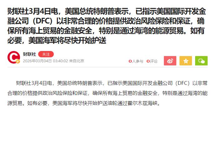 特朗普今天发文说:“即刻生效:我已下令美国国际开发金融公司(DFC)以极为合理的价格,为所有途经海湾地区的海上贸易(尤其是能源贸易)提供政治风险保险与担保,保障其金融安全。此项服务面向所有航运公司开放。 很多人看了可能会纳闷,特朗普这是好心,想保护这些船的安全吗?其实根本不是,这事看着是帮航运公司,背后全是美国的私心,还和最近中东打仗、油价上涨扯得特别紧。 先跟大家说清楚两个词,不用记复杂的,一听就懂。第一个是DFC,它不是普通的保险公司,是美国政府开的,花的是美国国库的钱,说白了就是美国政府的“工具”,不为赚钱,只为帮美国谋利益,不是做慈善的。 第二个是政治风险保险和担保,更简单。最近中东不太平,美国和以色列打了伊朗,海湾地区老打仗,船经过这里,可能会被袭击、被扣,或者没法通行,导致损失,这就是政治风险。 特朗普让DFC给的保险,就是船出了这种事,DFC赔钱;担保就是保证船做贸易的钱能顺利往来,不因为打仗出问题。他说价格便宜,就是为了让更多航运公司愿意来,吸引力大一点。 弄明白这俩事,就知道特朗普为啥要这么做了,不是突发奇想,全是为了自己和美国的利益,主要就两个原因,都和最近中东的事有关。 第一个原因,就是最近美伊打仗,全球油价涨得厉害,美国老百姓怨声载道。 伊朗守着一条叫霍尔木兹的海峡,全球五分之一的石油都从这过,伊朗说要封锁这条海峡,航运公司都怕了,不敢走,油价就涨得更凶,美国老百姓加油越来越贵,生活成本也高了。 特朗普要靠老百姓的选票,必须稳住油价,不然选票就没了,这是他最直接的想法。 第二个原因,美国想控制这条石油通道。谁能管着这条海峡,谁就能掌控全球的石油,巩固自己的地位。 以前遇到这种打仗的风险,私人保险公司都不敢承保,这次美国主动让DFC出面,还便宜,就是为了让所有航运公司继续走这条航线,不让通道断了。 而且航运公司用了美国的保险,就相当于和美国绑在了一起,美国以后就能更方便地管中东的事。 不过这事也没特朗普想的那么简单,能不能成还不好说。只要美伊还在打仗,航运公司还是会担心,因为美国在中东的军舰不多,大部分要用来打伊朗、拦导弹,能护航的没几艘,而且护航也很危险。 另外,伊朗自己也得靠这条海峡运石油,不敢长期封锁,但只要打仗,风险就一直在,油价也难真的降下来。 这事看着和我们没关系,其实不然。全球油价稳了,我们国内加油也能便宜点;要是冲突一直持续,油价继续涨,我们加油、买东西都会更贵,影响日常生活。 后续怎么样,就看美伊啥时候停火,我们多关注就好,毕竟这些国际大事,最后都会影响到我们的日子。