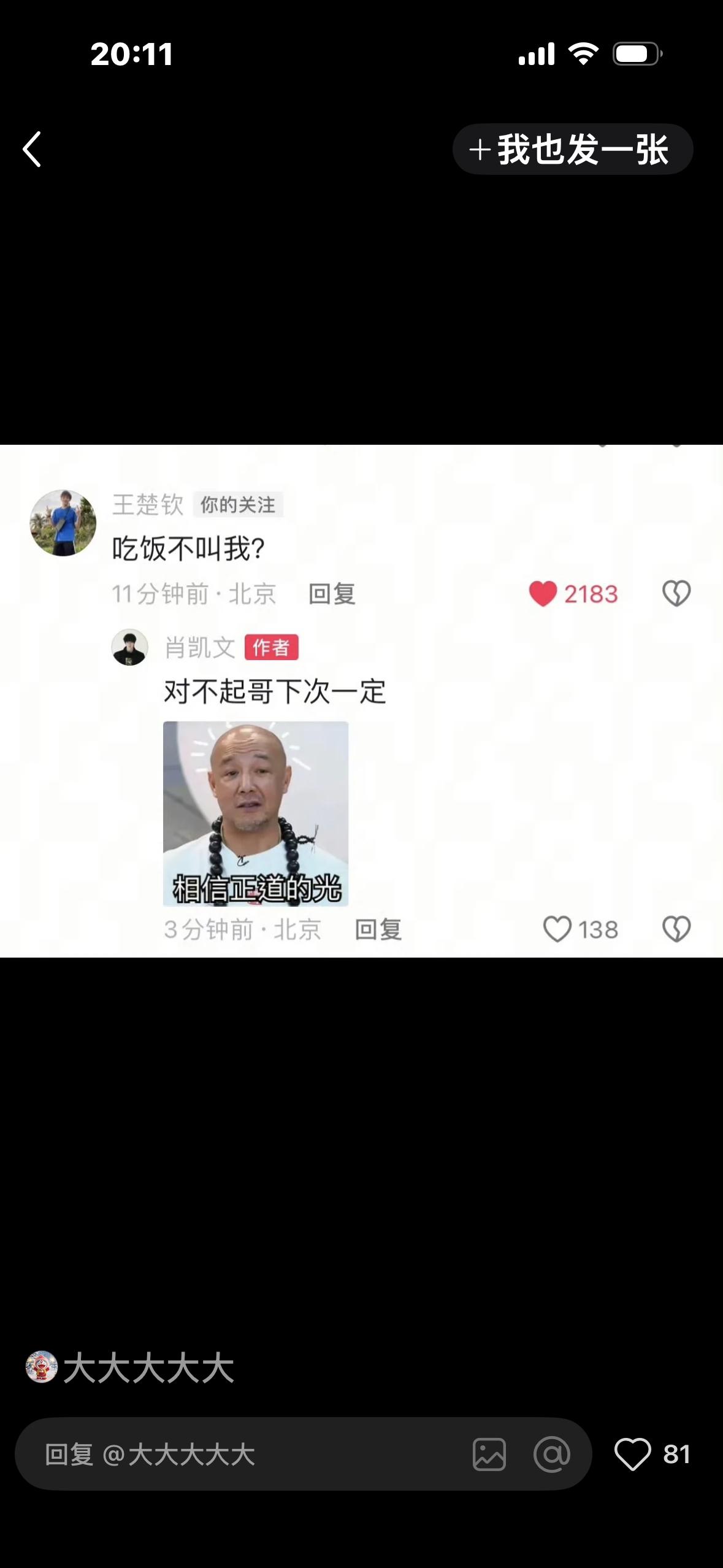 别看王楚钦在镜头前一向憨憨的, 其实情商非常高。 肖凯文发文和老爹肖战吃汤圆的图片, 王楚钦立马去留言:吃饭不叫我? 许昕发了打网球的视频, 王楚钦留言:前三板看着就不好过呀,昕哥。 很多人不明白, 以为王楚钦仅仅在和朋友互动, 其实王楚钦有着巨大的流量, 一条留言价值千金, 所以大头的留言其实是在力挺两位好友的事业。