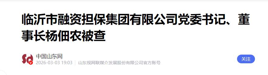 躲得过初一躲不过十五,元宵节当天,临沂市融资担保集团董事长杨佃农任上被查。杨佃农2025年11月刚刚被任命为董事长,至此番被查,其担任新职尚不足4个月。 杨佃农的落马,用事实击碎了一个长久以来的职场幻觉。很多人曾以为,只要职位变动了、调离了原岗位,过去的那些“老账”就能顺势抹平,安全过关。可惜,不是。 杨佃农出生于1973年,正值干事创业的壮年。他在财政局、地方金融局等核心财金部门摸爬滚打多年,业务能力和资历都不缺。 2025年11月,他被任命为集团董事长,这本该是他职业生涯的新高点。谁能想到,在任时间还不到120天,他就在这个新位子上“折了”。 其实,杨佃农的被查并非孤立事件。就在他落马的前一天,临沂政坛已经连续震动。曾任郯城县委书记、已经63岁的刘纪民,以及市管干部刘振超先后被通报调查。刘纪民已经退居二线,但依然被揪了出来。 这种覆盖不同年龄层、不同职级状态的调查,清晰地传递出一个信号,不管是退休还是换岗,法律的追责都没有保质期。 观察这次被查干部的背景可以发现,涉及的领域非常广泛,涵盖了人大、金融、科协等多个部门。 临沂融资担保集团董事长的位置曾空缺多时,原本大家对杨佃农寄予厚望,希望他能带好这块金融“肥田”,结果他却成了当地任职时间极短的典型。 办案效率的提升,背后是监管手段的彻底升级。从2025年的全国数据来看,立案数量明显增加,尤其是金融、能源等资金密集的领域被盯得最死。 现在的数字化办案系统非常厉害,它能精准复原所有的交易轨迹。那些以前觉得能瞒天过海、通过复杂手段掩盖的违规操作,在如今的大数据比对面前,几乎全是漏洞。 同时,社会监督的网络也织得越来越密。现在通过手机平台,普通人就能直接提供线索。 而且,行贿人黑名单已经全国联网,原来那种靠砸钱买平安、靠关系网“消灾”的路子,已经走不通了。受贿和行贿一起打击,让原本牢固的利益同盟迅速瓦解。 临沂的这起案例,其实是一个时代的缩影。治理方式正在从“事后围堵”转向“全流程监控”,权力的边界被划得清清楚楚。 事实证明,靠频繁调动岗位来掩盖旧账,早已不再是避风港。对于公职人员来说,廉洁早已不是什么高标要求,而是最基本的职业生存底线。 临沂的情况让大家看得很明白,只要触碰红线,就没有所谓的安全地带。这种高压态势,正在让权力回归到它服务公共利益的本位。 信息来源:《临沂市融资担保集团有限公司党委书记、董事长杨佃农被查》,中国山东网,2026年3月3日。