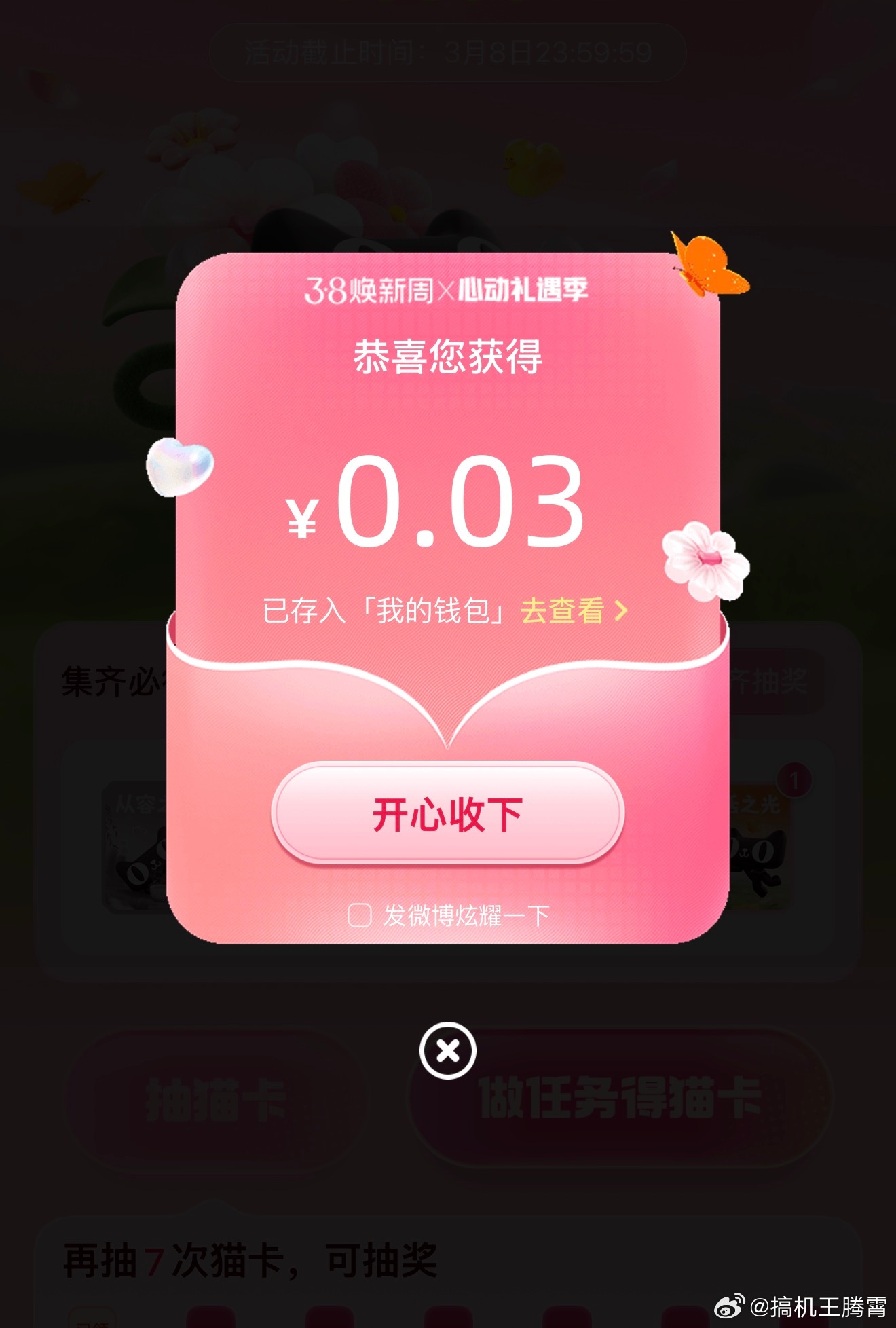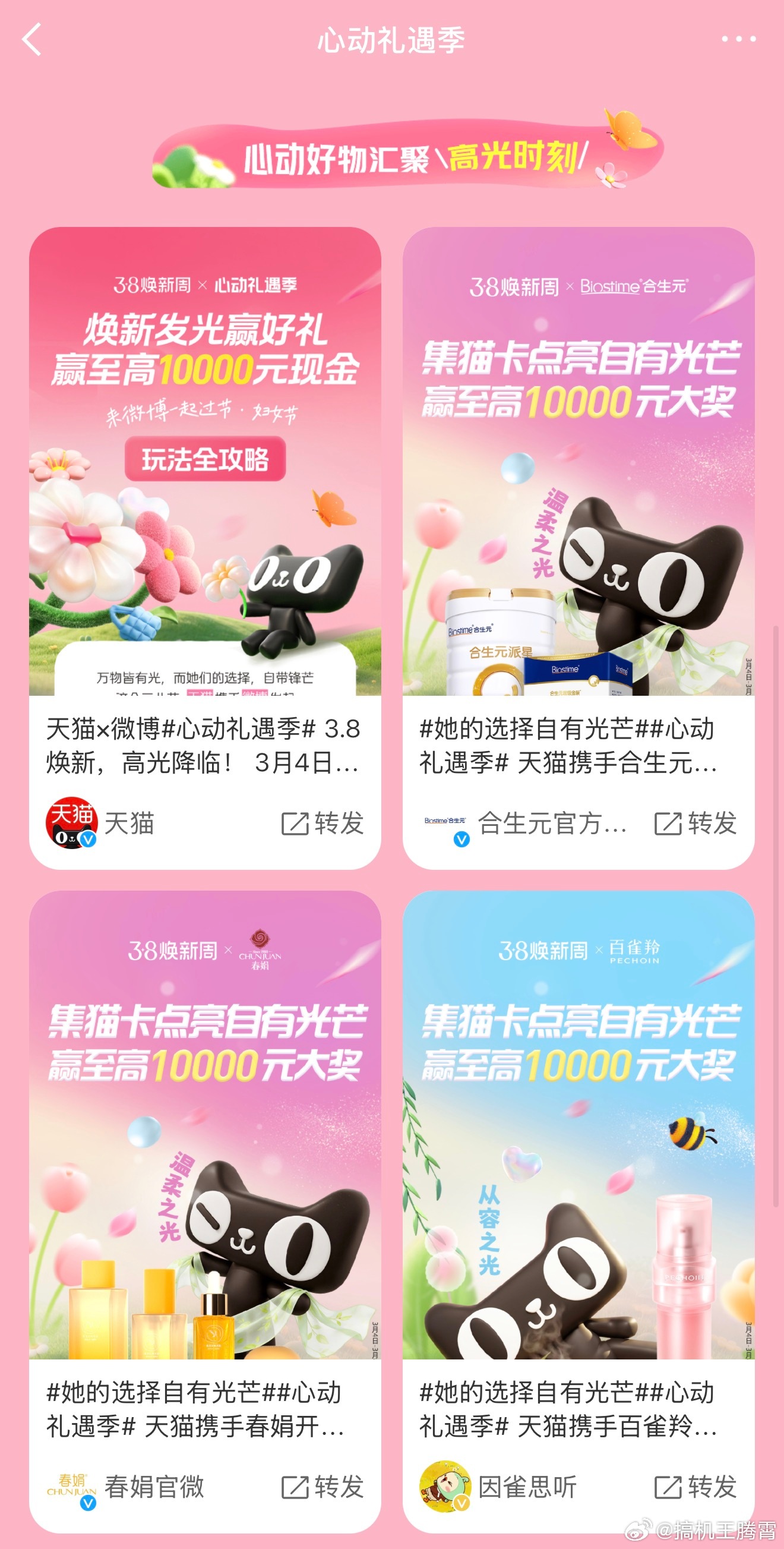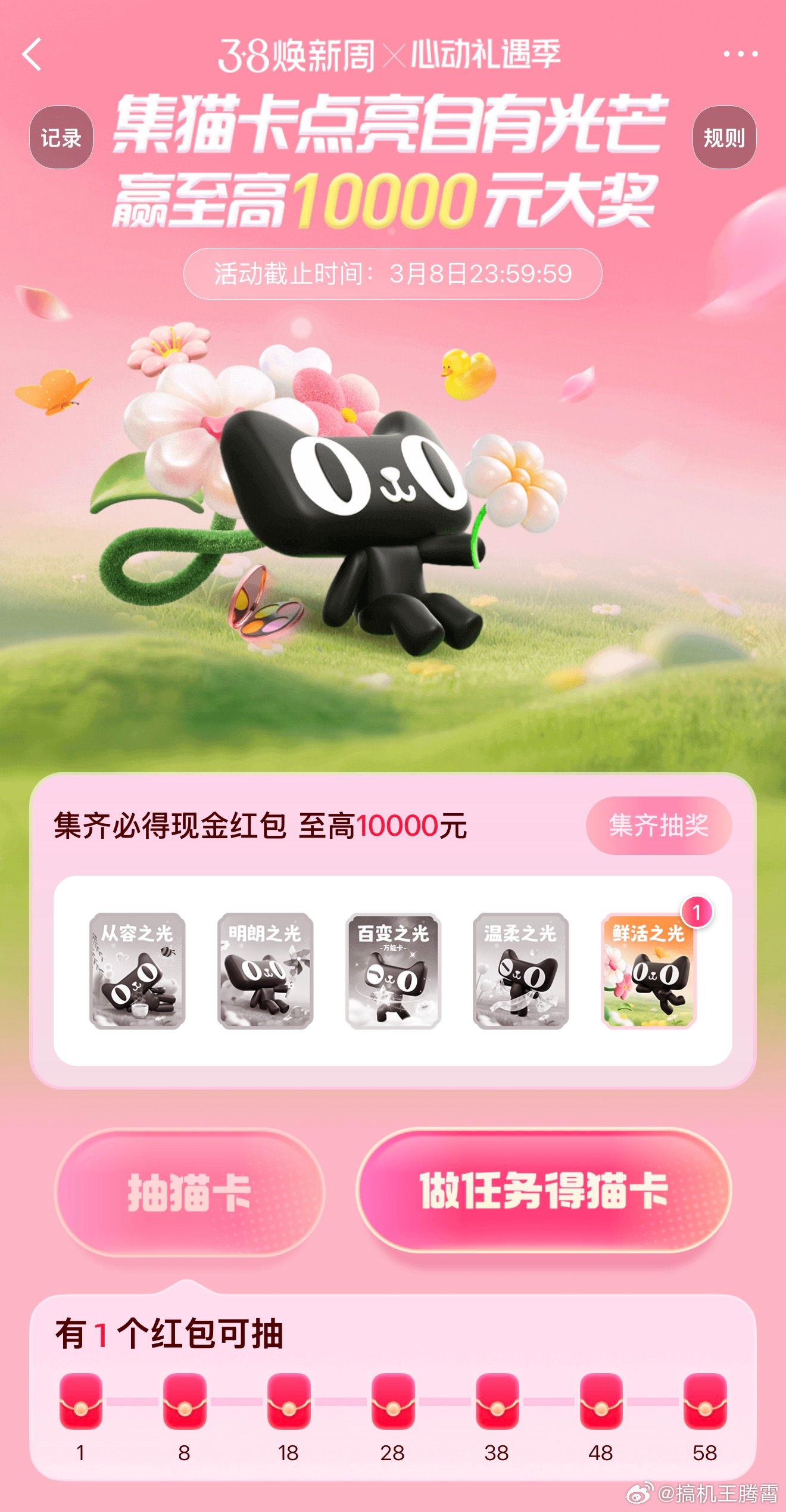 晒出属于你的光天猫和微博合作的38焕新周抽卡活动上线咯!3月4日~8日,微博下面导航栏点「我」,然后再点「心动礼遇季」就能进去,当然也可以直接戳右边👉🏻:网页链接 。一共四款猫卡,简单做任务就能抽,集够指定数量还能能领红包,逛联动品牌主页、转赞博文还能领额外卡,甚至能蹲到稀有万能卡。抽猫卡不仅有机会获得38焕新好礼,集齐四款卡还有机会冲击万元大奖,大家快来玩玩看,随手做任务就有福利,别错过