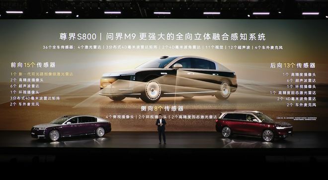 目前尊界S800和问界M9全车具备36个传感器,包含4个激光雷达、3个分布式4D毫米波雷达、2个4D毫米波雷达、11个摄像头、12个超声波雷达和4个车外麦克风,可以对车辆周围环境实现精准的识别。