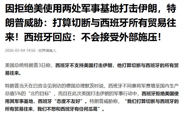 税宗气得要冒烟了,威胁要和西班牙断交。 中方回应美威胁切断与西班牙贸易 西班牙雄起![赞]干得漂亮。比英法德强多了。 西班牙不惯着美国。不把军费加到5%,不让美军用西班牙的军事基地。 世界霸主有什么好稀奇的,当年西班牙也当过的。 美国现在是霸主,但是明天可能就不是霸主了。 这一点,西班牙太有经验了。[笑哭] 点右上角关注我,我们一起去看这个魔幻的世界