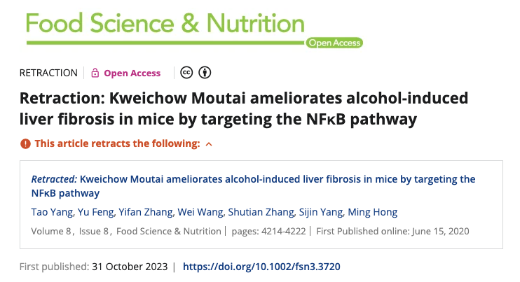 这个炸裂的研究,不禁这让人回想起了2020年关于茅台的知名研究——茅台酒可以减轻小鼠的酒精性肝纤维化。虽然同样炸裂,但茅台那篇文章在2023年就被撤回。