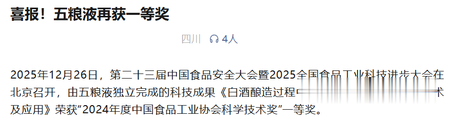 事实上,五粮液近年来确实在这方面研究努力。比如去年年底,五粮液才发布喜报,称五粮液独立完成科技成果《白酒酿造过程中生物活性成分解析关键技术及应用》荣获“2024年度中国食品工业协会科学技术奖”一等奖。其中就提到,成功识别出148种功能物质,其中超过80%为白酒领域中首次发现,包括多酚、短肽、甾醇等,部分已在医学领域被广泛证实具有促进细胞修复、抗氧化、辅助降血压等潜在健康作用。