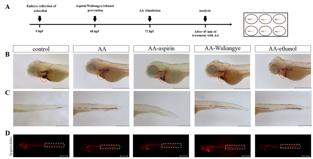 据丁香园的文章,该研究通过采用诱导斑马鱼胚胎血栓模型,分别用阿司匹林、稀释到0.3%乙醇含量的五粮液、纯乙醇预处理斑马鱼胚胎,再用花生四烯酸诱导血栓,通过对比得出结论:五粮液对降低血栓的效果,比阿司匹林更好。