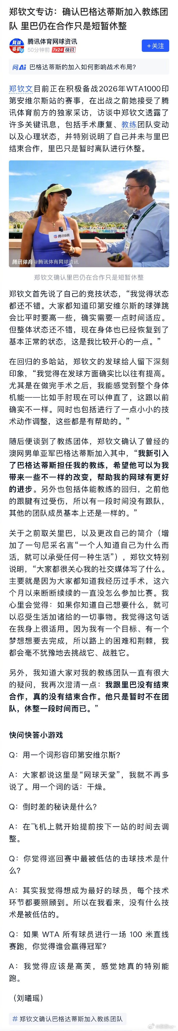 郑钦文回应换教练传闻IW媒体日,郑钦文接受专访,正式回应近期教练团队变动传闻。“我跟里巴没有结束合作,真的没有结束合作。他只是暂时不在团队,休整一段时间而已。”“我新引入了巴格达蒂斯担任我的教练,希望他可以为我带来一些不一样的改变,帮助我的网球有更好的进步。”期待在新的助力下,文文实现更多更全面的突破,稳步提升。专注赛场,静待成长!为郑钦文加油网球talking大会
