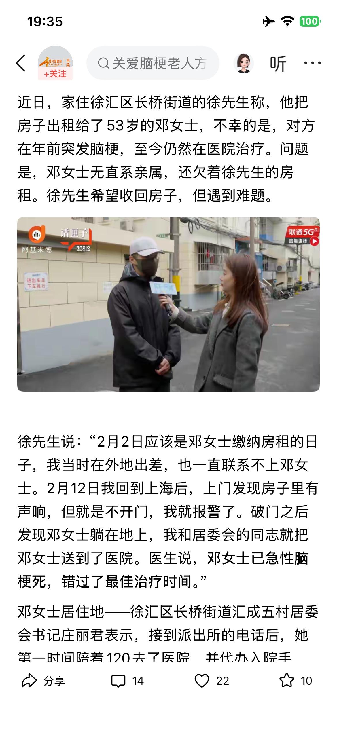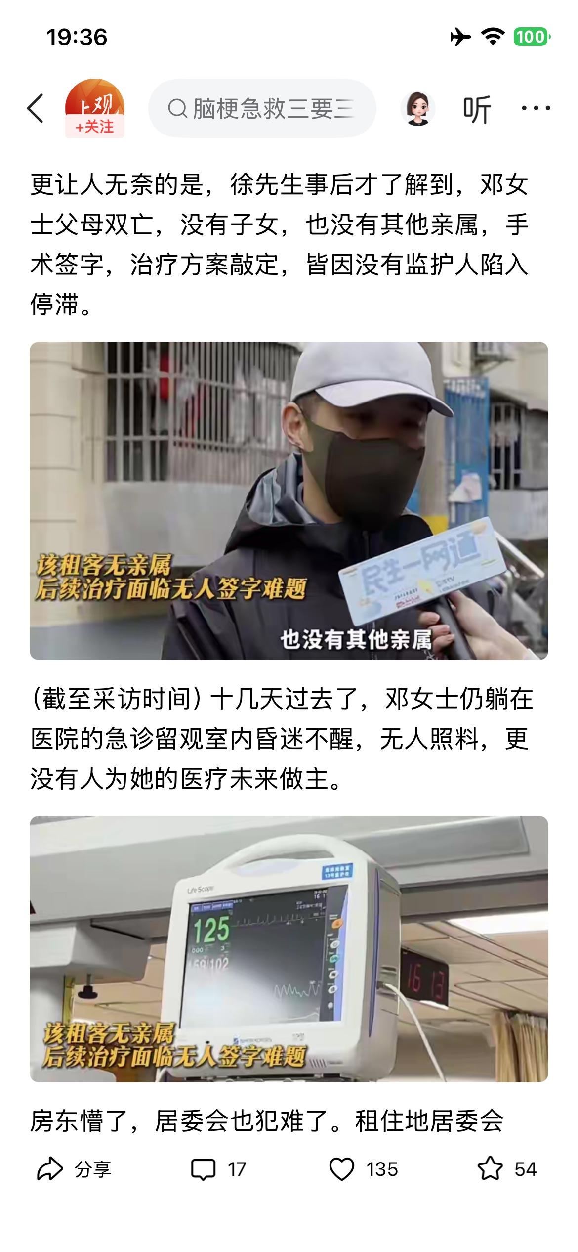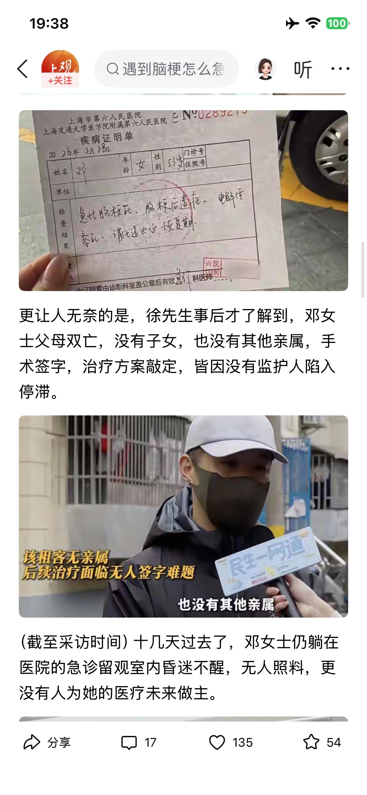 强烈呼吁,单身人群遗产继承要与时俱进。 又一例了,也是单身女士,53岁,出租屋突发脑梗,有动迁款没买房,也是因无子女、无监护人,手术陷入僵局。按理,单身人士如无法定继承人,遗产依法收归国有(集体),既然最后是国家收回,用以公益事业,那么收归单位(受益对象),手术时是否可以签字? 谁负责拿钱,谁承担签字风险,是这理吧? 现在的大龄单身人群越来越多了,希望国家出台相关法规。 对于单身人士来说,也要及早咨询相关法律,提前立遗嘱,以免碰上类似困境。