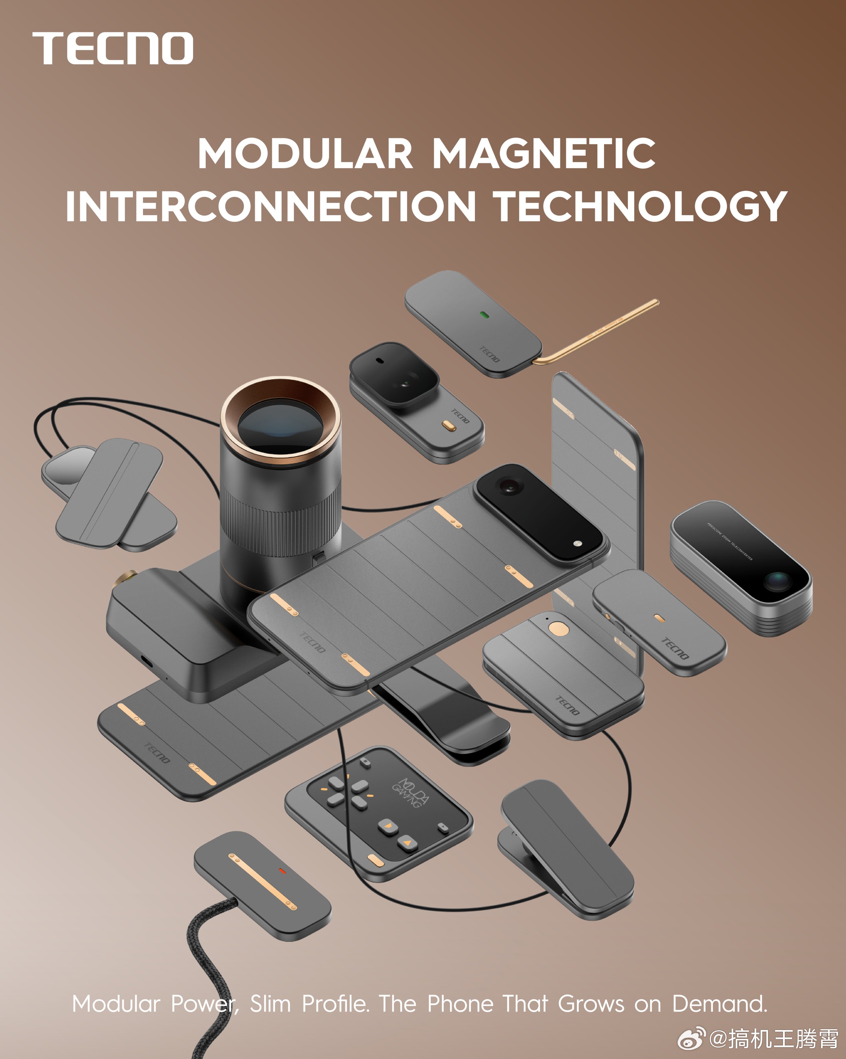该说不说传音搞的这个模块化概念机还是有点意思的,手机本身像iPhone Air一样薄,只有4.9mm厚,背面有磁吸触点,然后把手机上的功能全部打散成各种模块,例如充电宝模块、卫星通讯模块、扬声器模块、摄像头模块、游戏手柄模块等等,你可以自由组合,可玩性倒是挺高的,不过你们觉得这设计咋样?